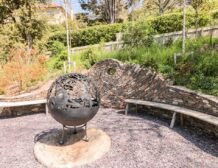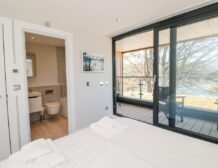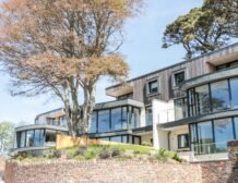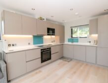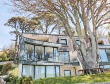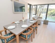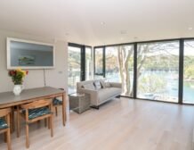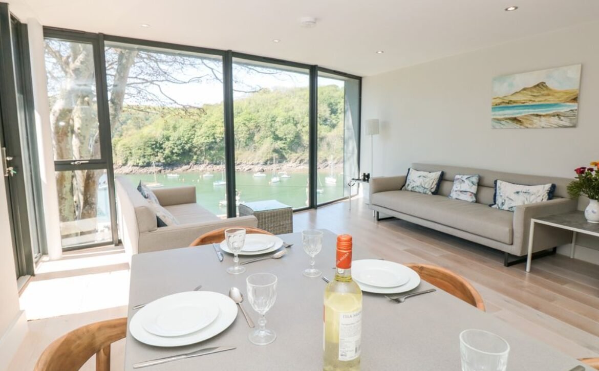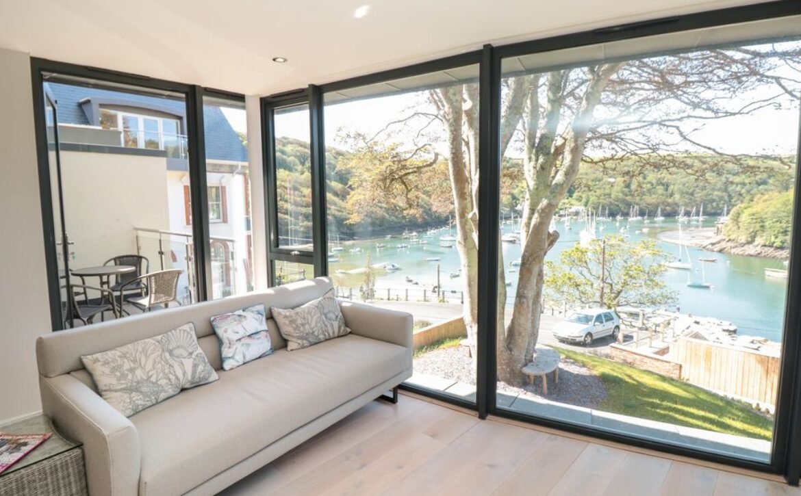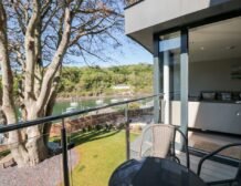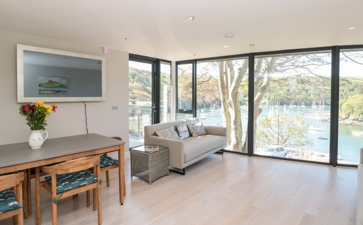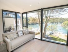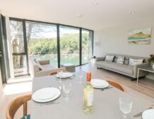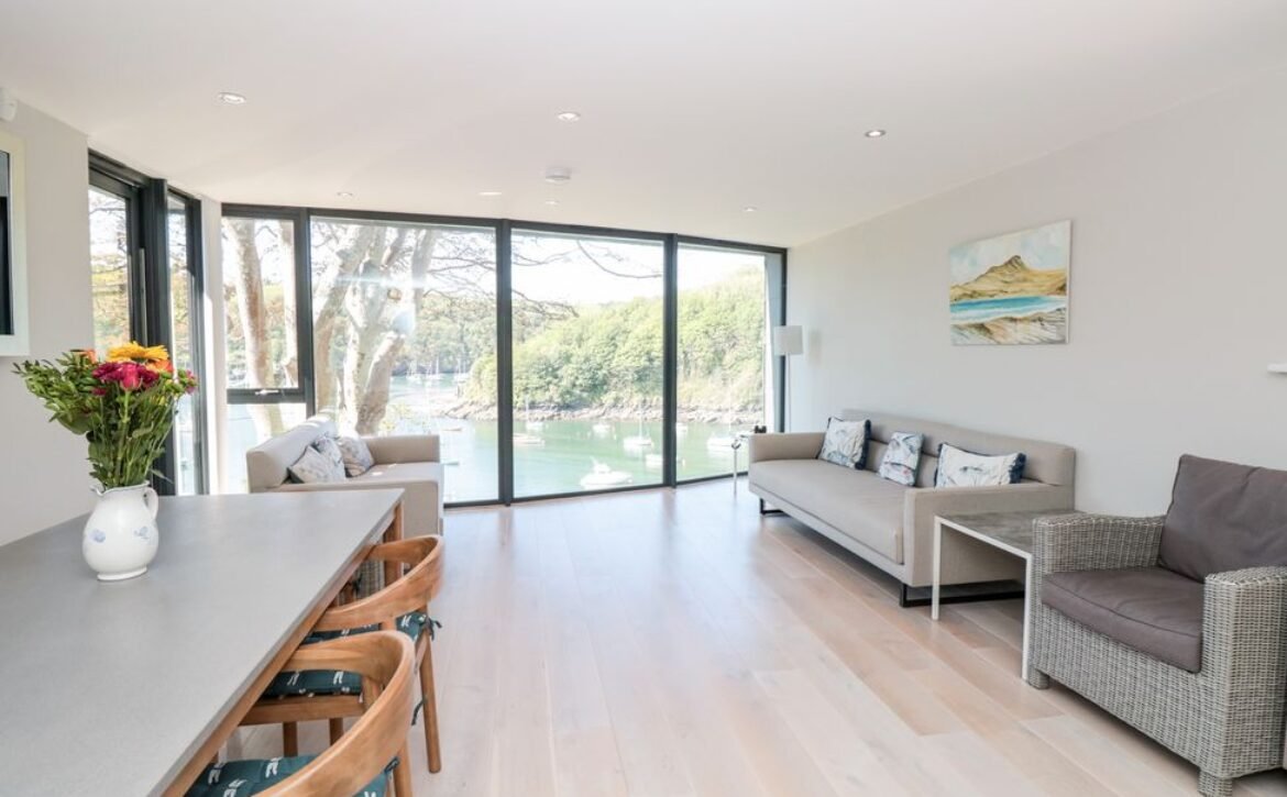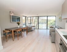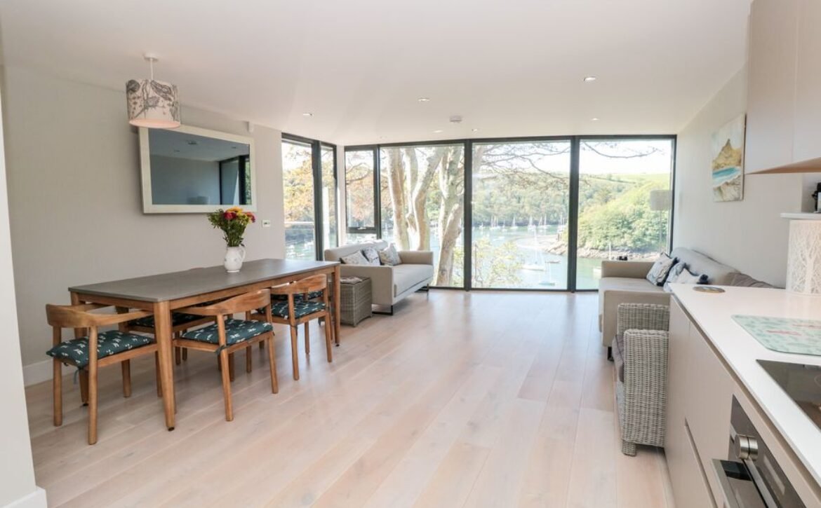 The apartment is reached via 13 external steps and once inside the contemporary open-plan living space can be found to the right, with large picture windows providing glorious views of the creek.