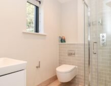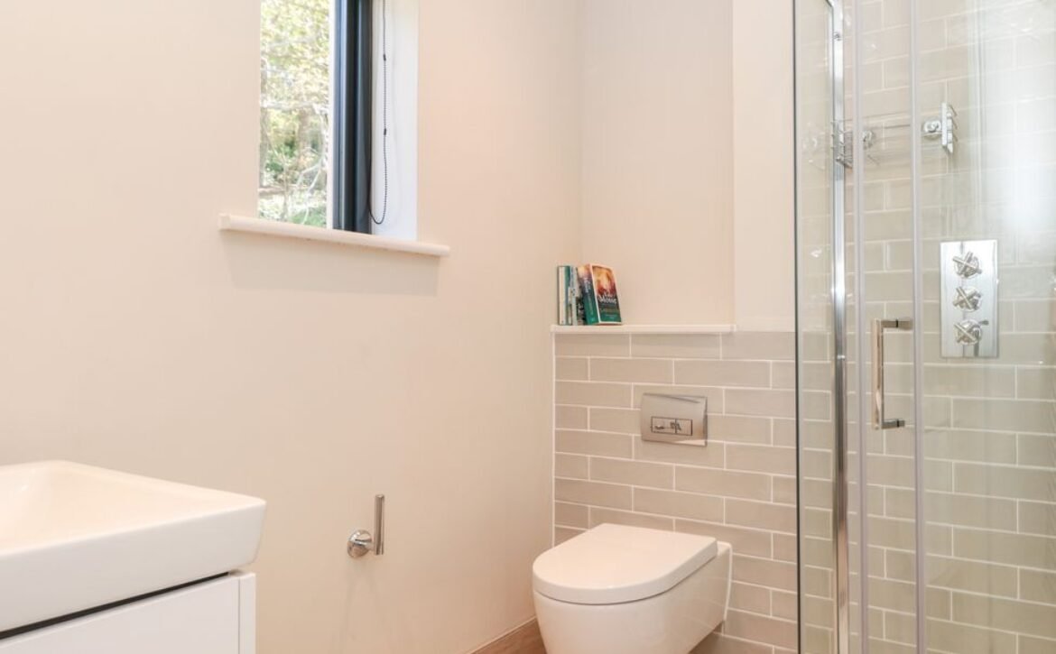 - First-floor shower room with walk-in shower, basin, heated towel rail and WC
