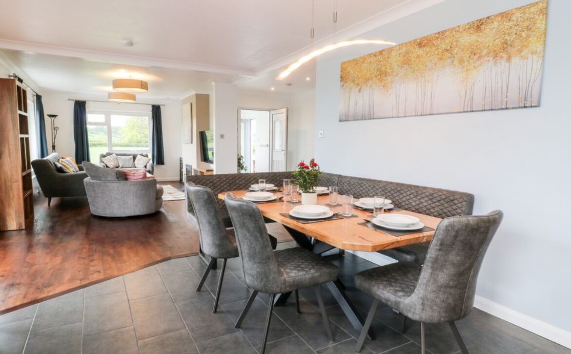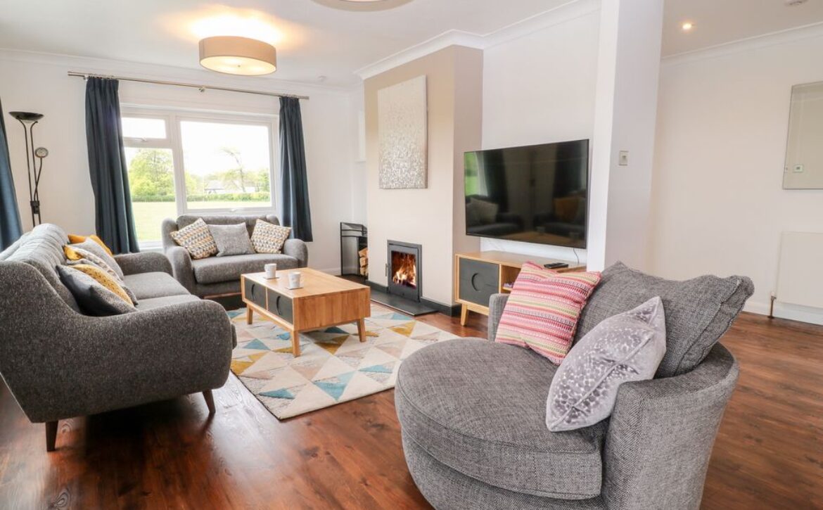 - Open-plan living space with kitchen, dining area and sitting area with woodburning stove