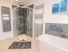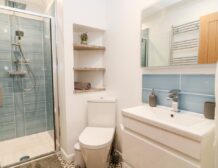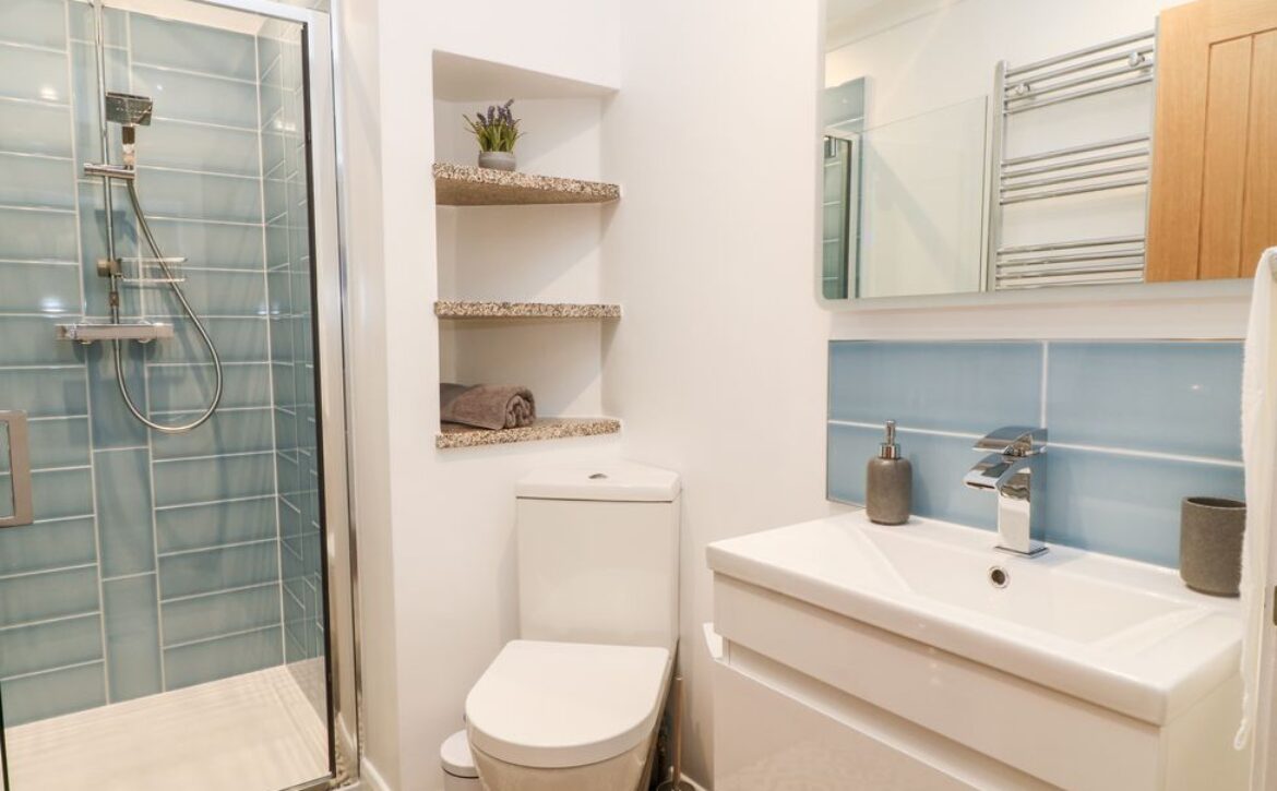 - Shower room with walk-in shower, basin, heated towel rail and WC