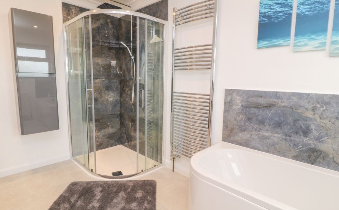 - Bathroom with bath, walk-in shower, basin, heated towel rail and WC