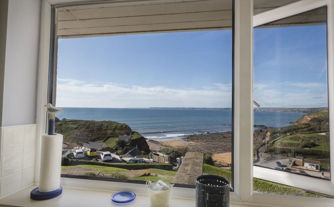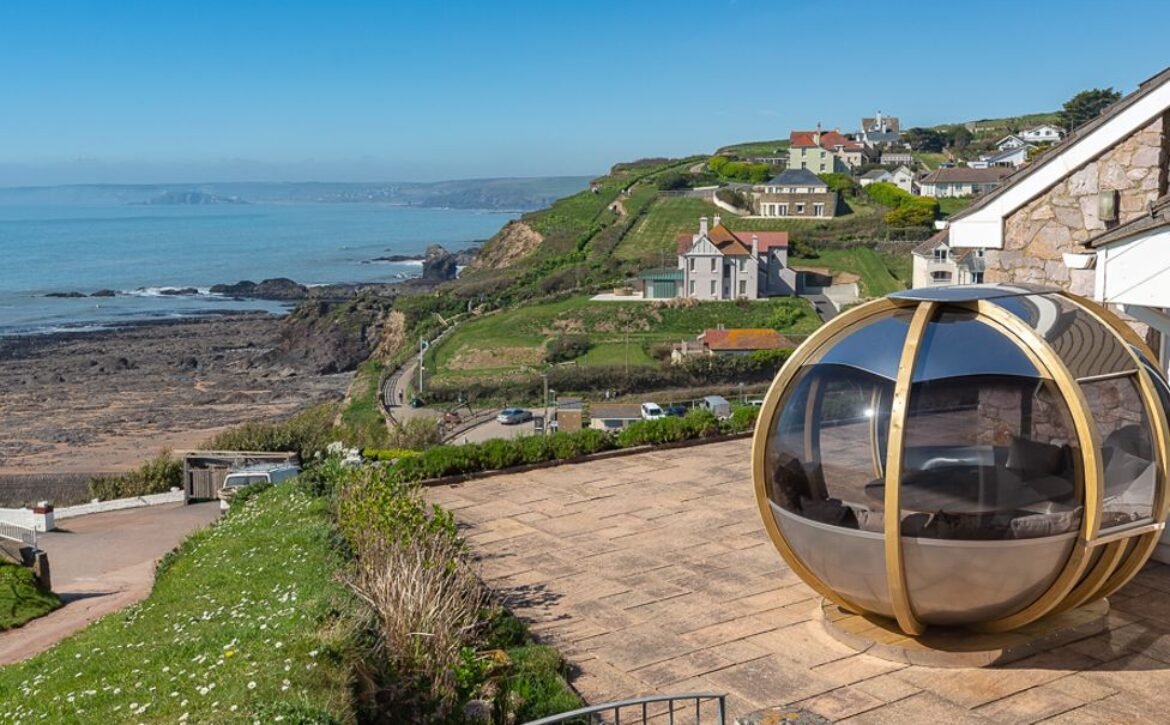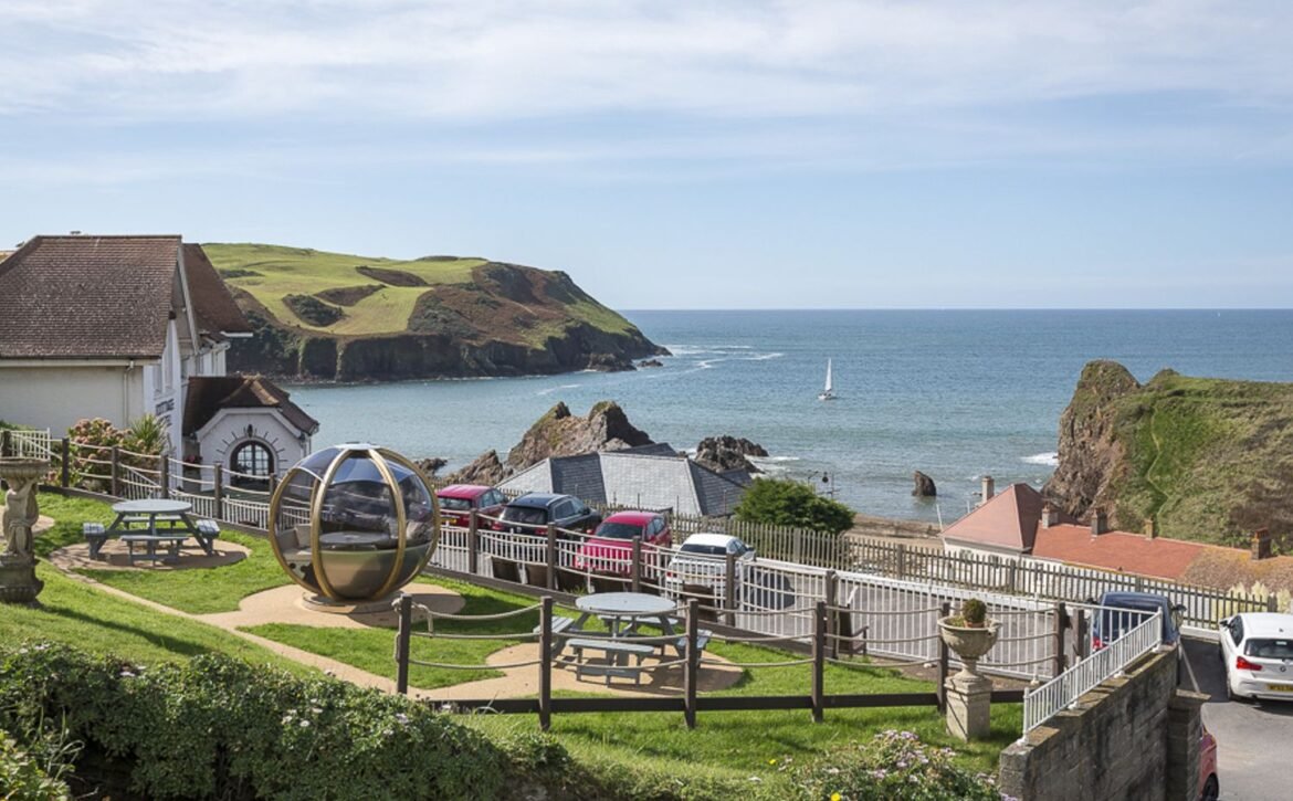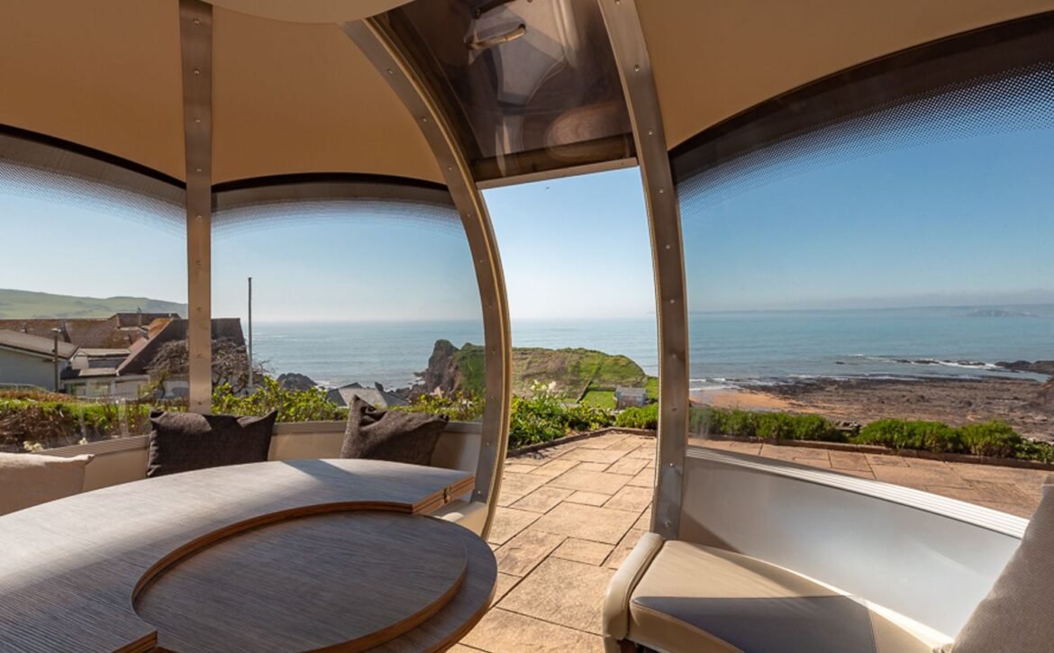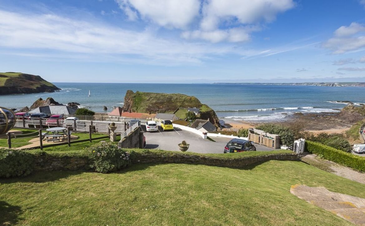 From the terrace, the view stretches from Hope Cove to Thurlestone, towards Plymouth and Cornwall.