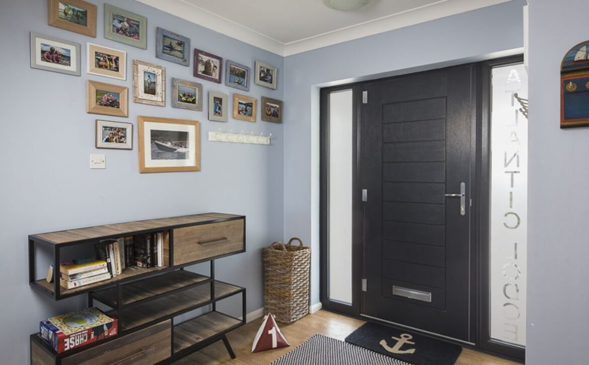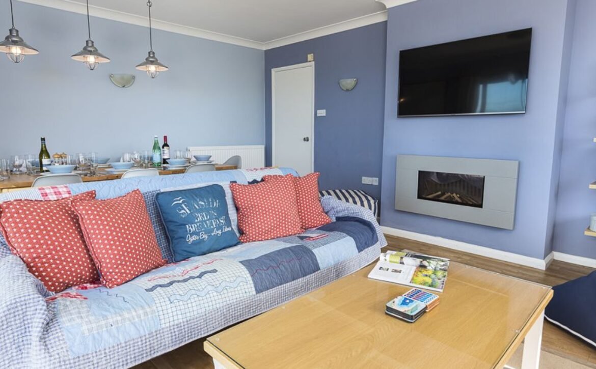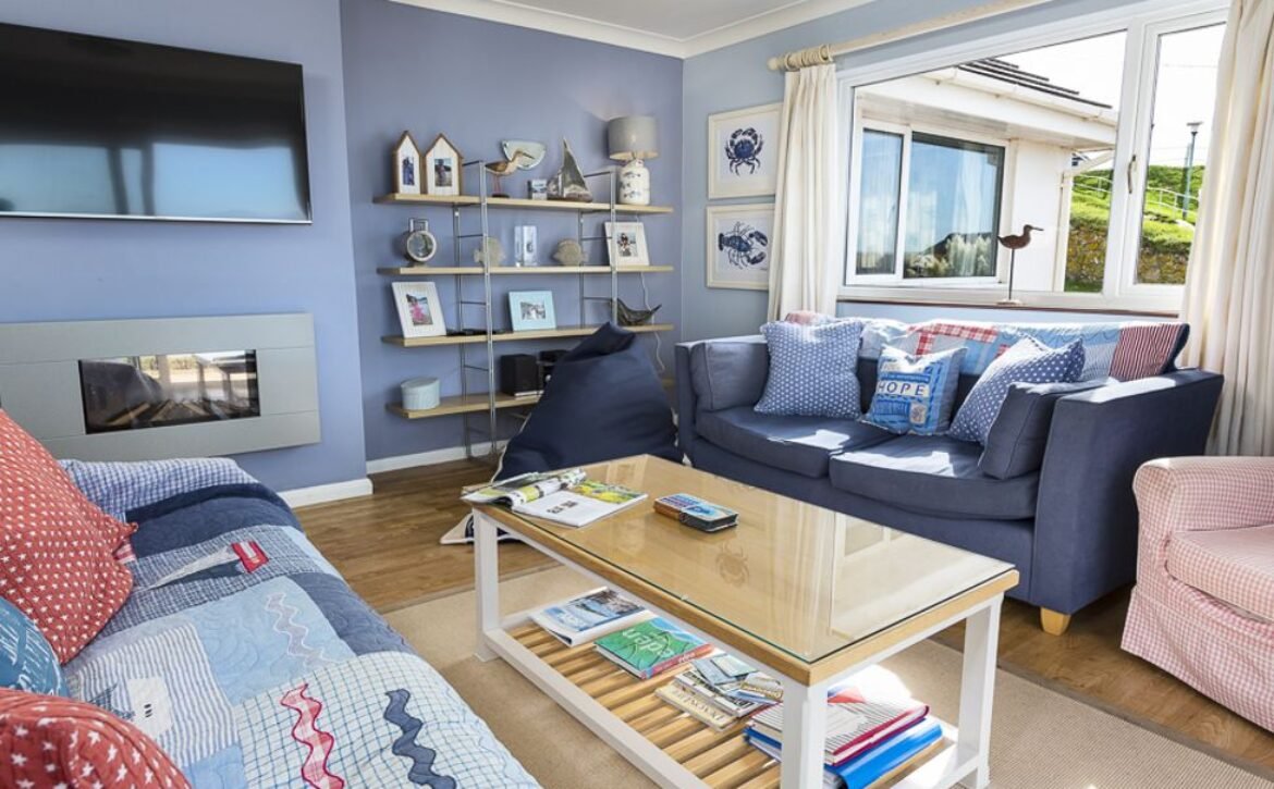 Decorated to a high standard, the living area has a cosy wall-mounted fireplace, smart TV and doors that lead out to the terrace.