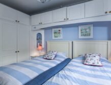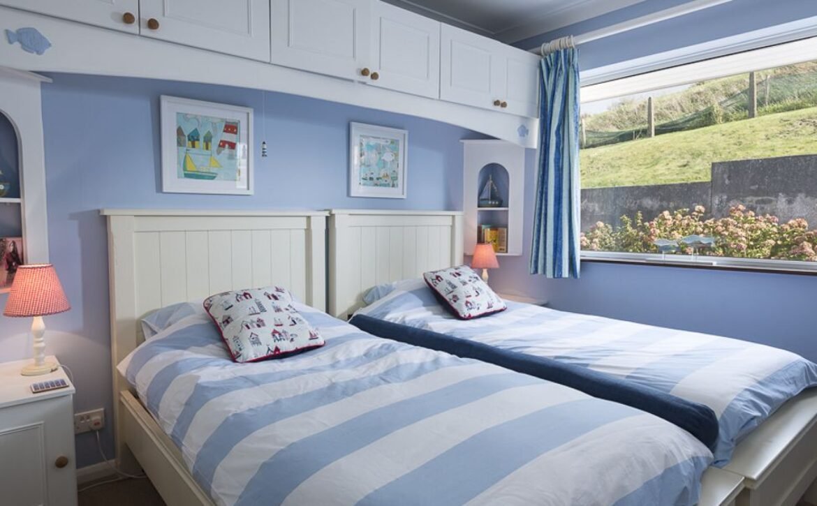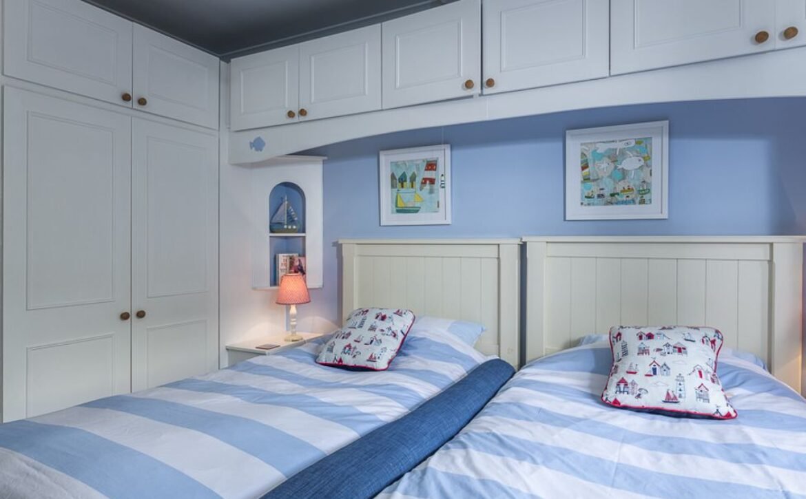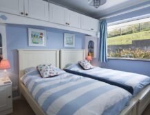 The twin bedroom has two single beds, fitted wardrobe and units and a separate wash-hand basin.