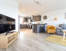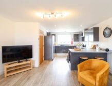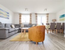 Downstairs you are treated to an open-plan living room, which is most definitely the heart of the home; with a large, sumptuous sofa and comfy armchairs it is the perfect spot for evenings in with a book or cuddled up watching a film on the Smart TV.