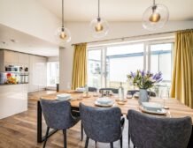 Climb the stairs up to the first floor, where you can look forward to conjuring up culinary feasts in the fully-equipped kitchen, complete with dishwasher, coffee machine and wine cooler for keeping your favourite bottle chilled.