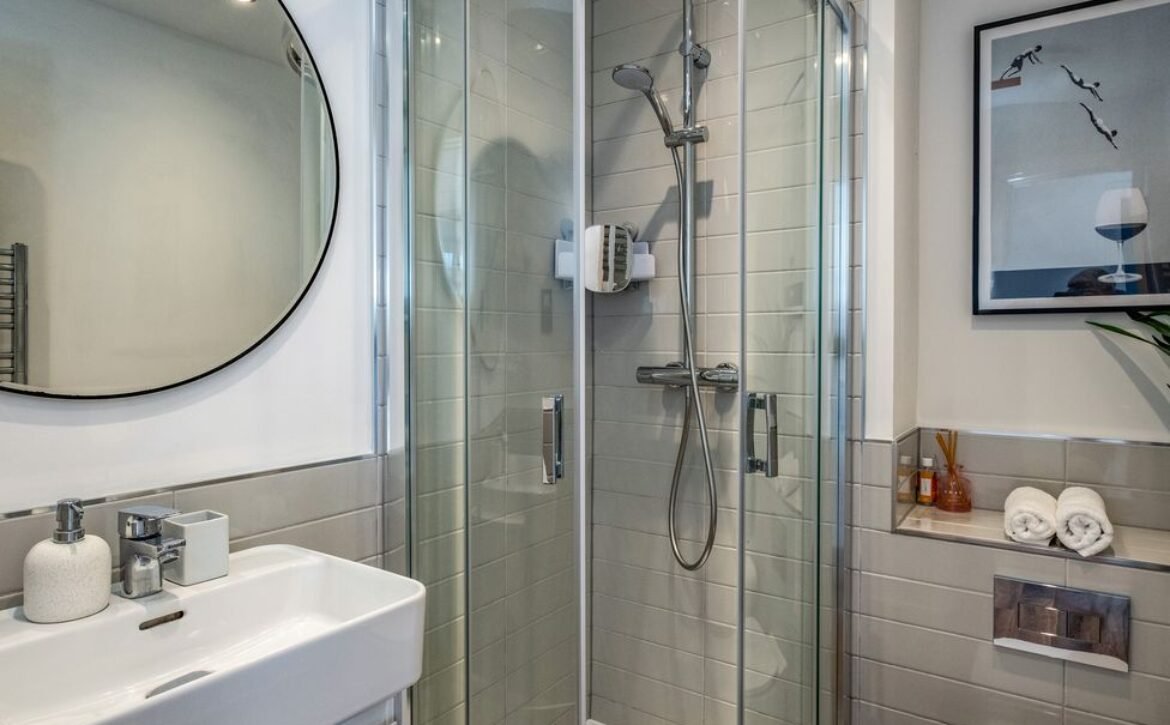 - Shower room with walk-in shower, basin, heated towel rail and WC