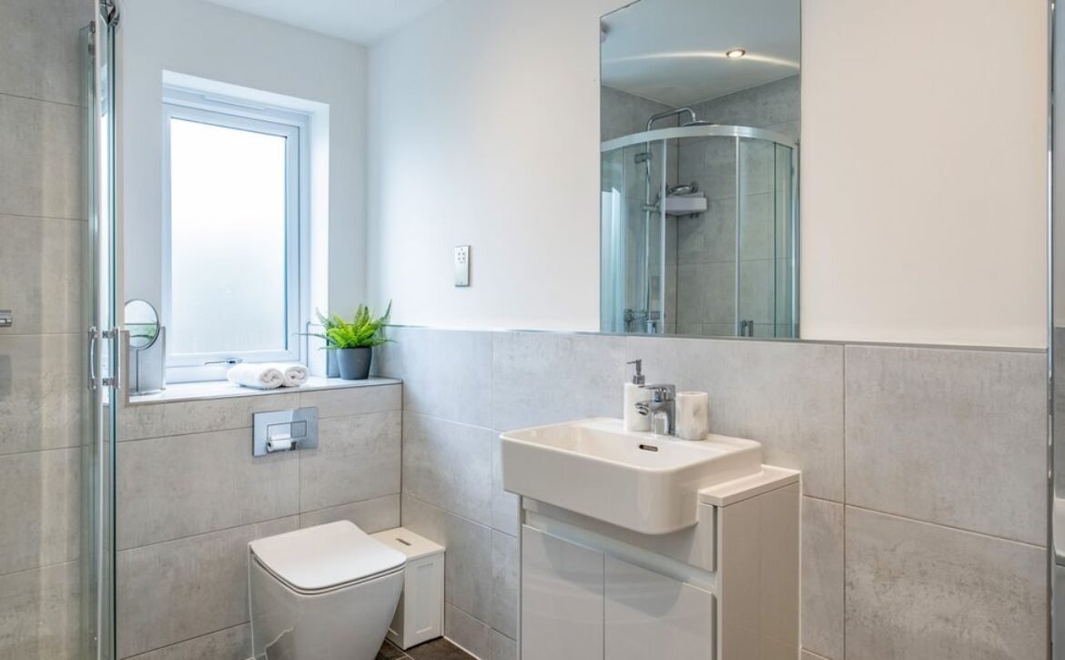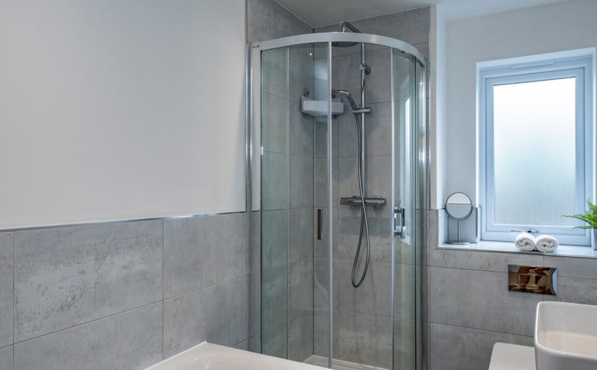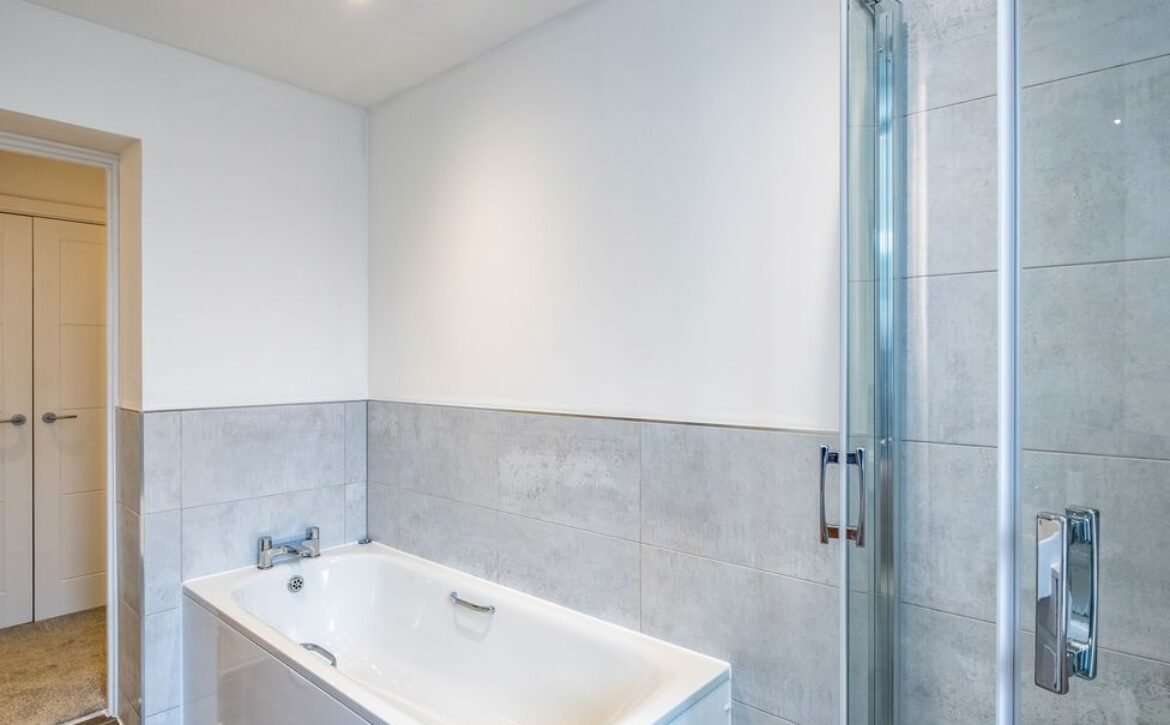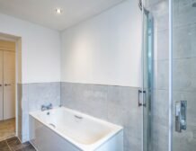 - Ground-floor bathroom with bath, walk-in shower, basin, heated towel rail and WC