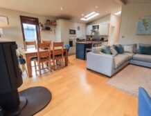 - Open-plan living space with kitchen, dining and sitting room with woodburning stove.