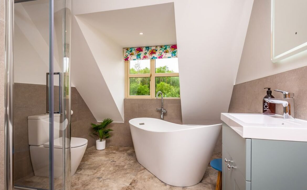 Indulge in a moment of relaxation in the luxury family bathroom, which offers a free-standing slipper bath and large walk-in shower.