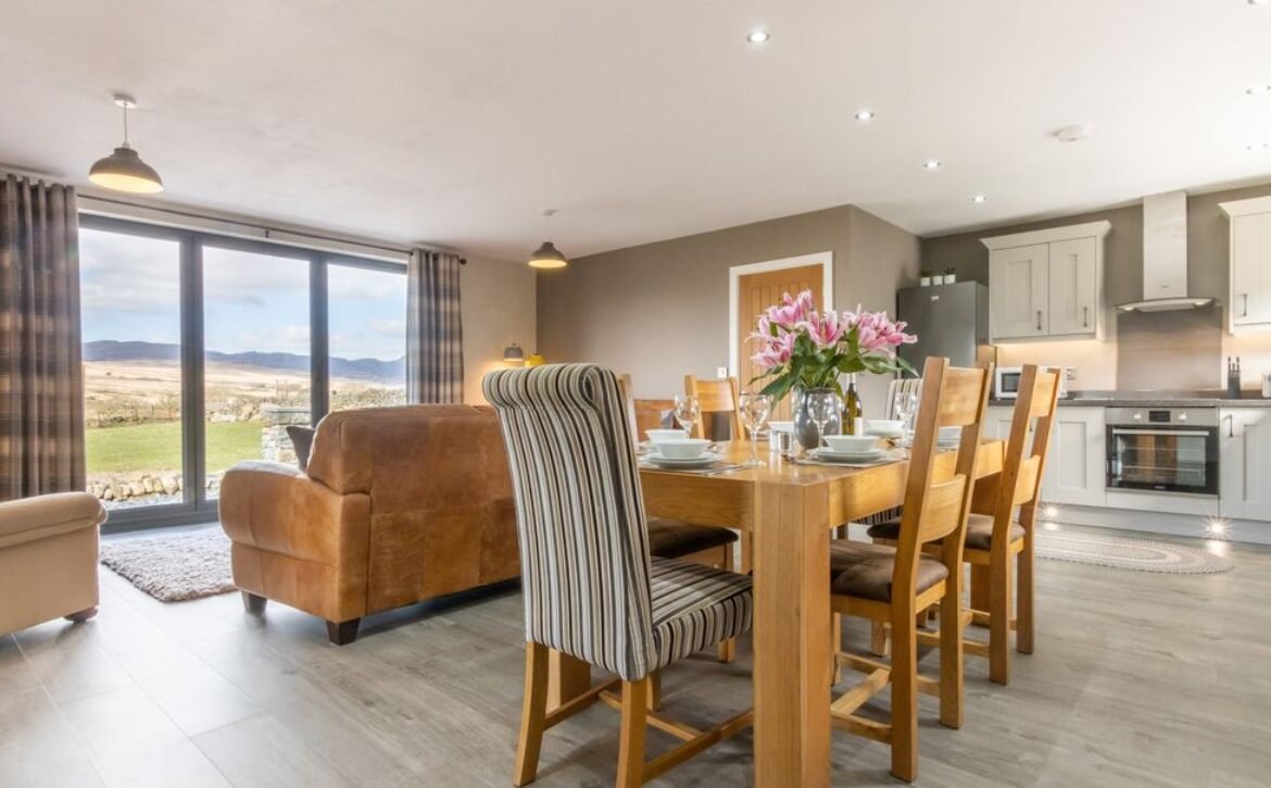 - Open plan living room with kitchen, dining area and sitting area