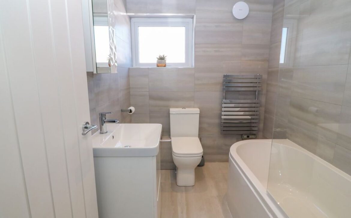- Ground-floor shower room with walk-in shower, basin, heated towel rail, and WC