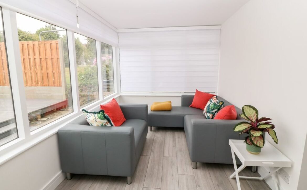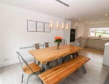 Enter the main social hub of the property, flooded with natural light, complete with a corner sofa, a woodburning stove, a sleek kitchen and utility, with all expected appliances, and a generously-sized dining table, to cater to your entire party.