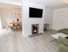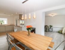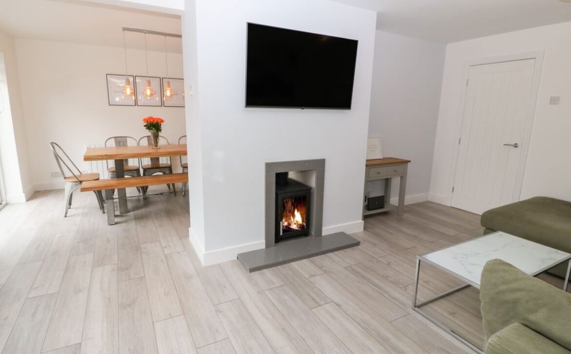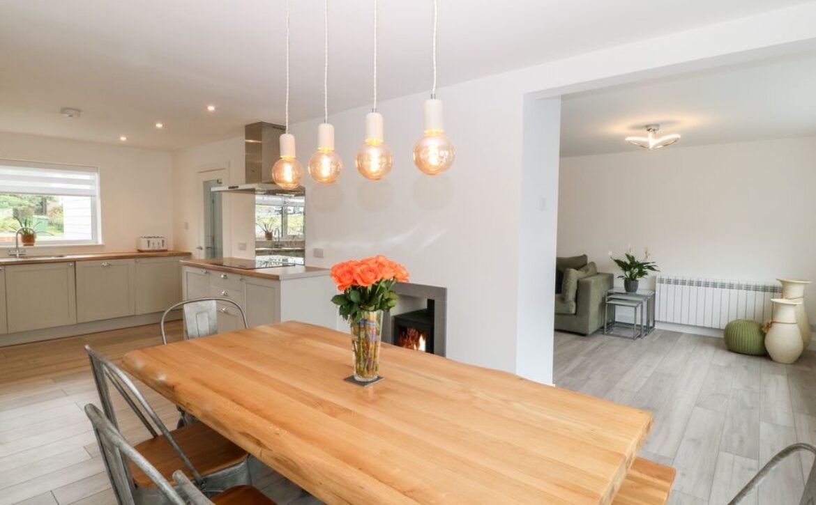- Open-plan living space with kitchen, dining area and sitting area with woodburning stove