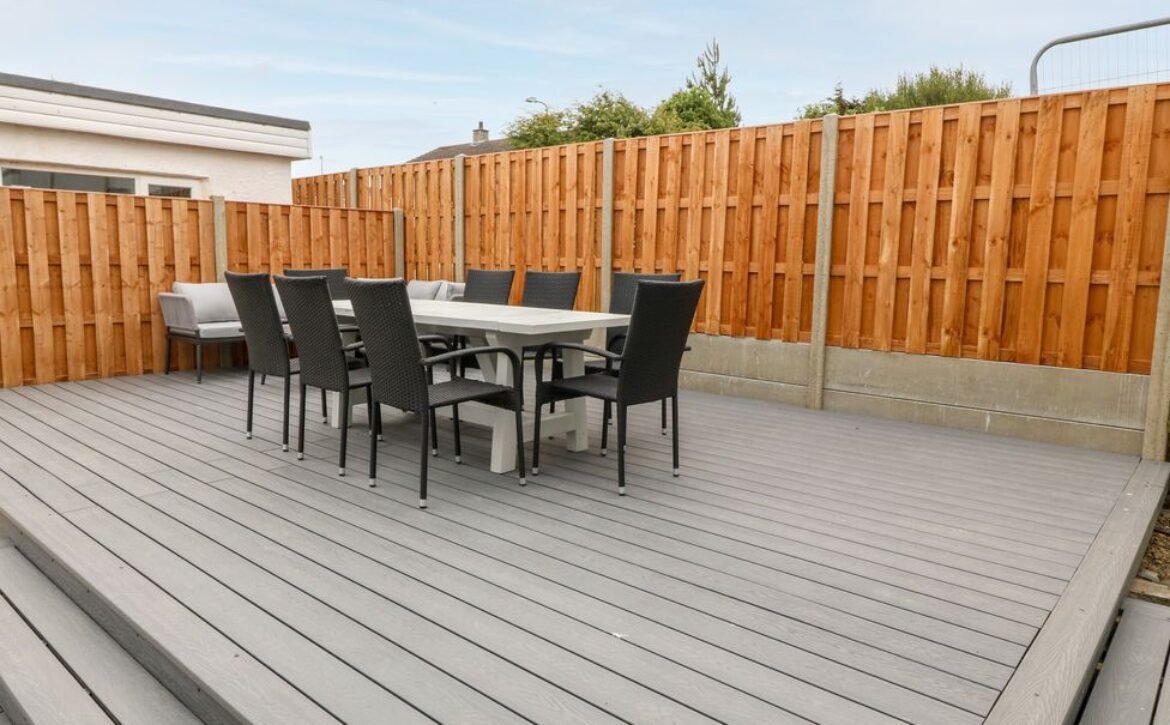 - Enclosed rear multi-level garden with lawn, decking, furniture, and hot tub