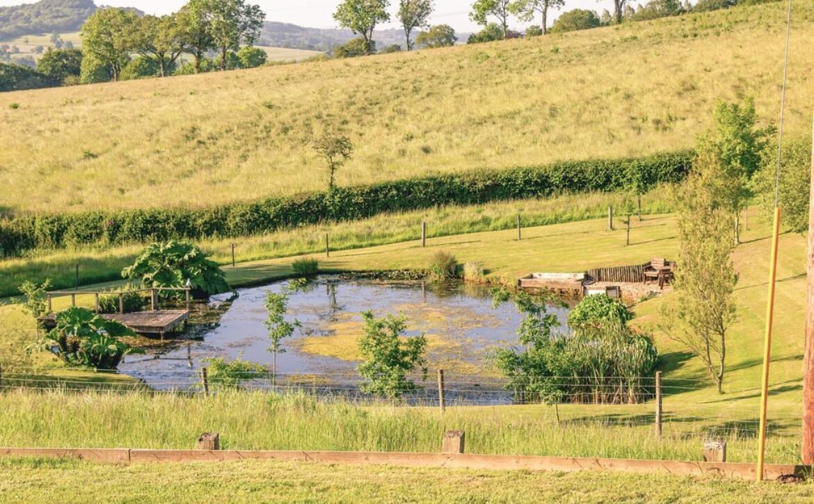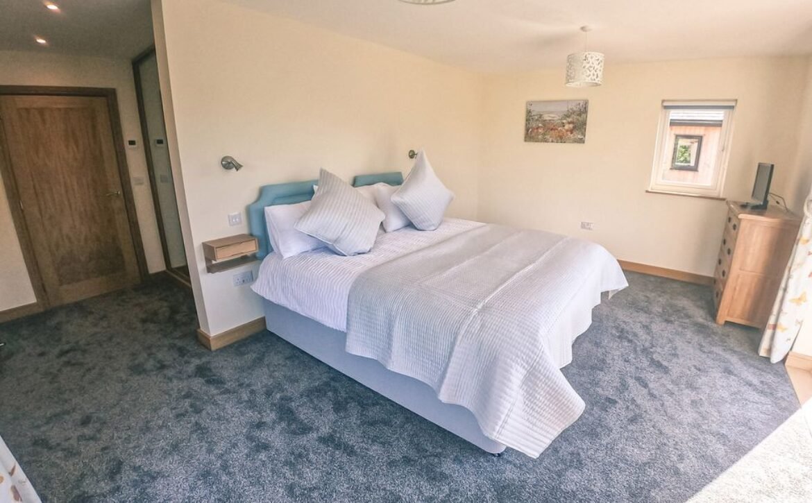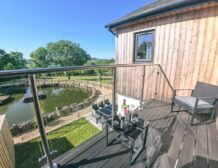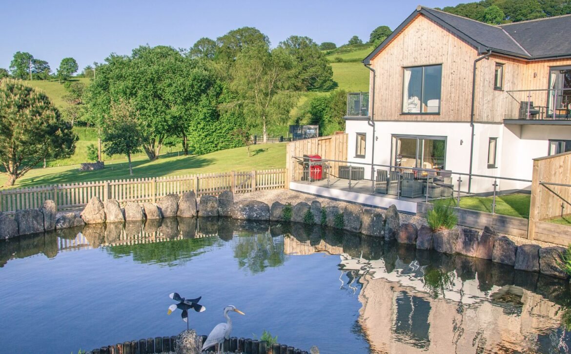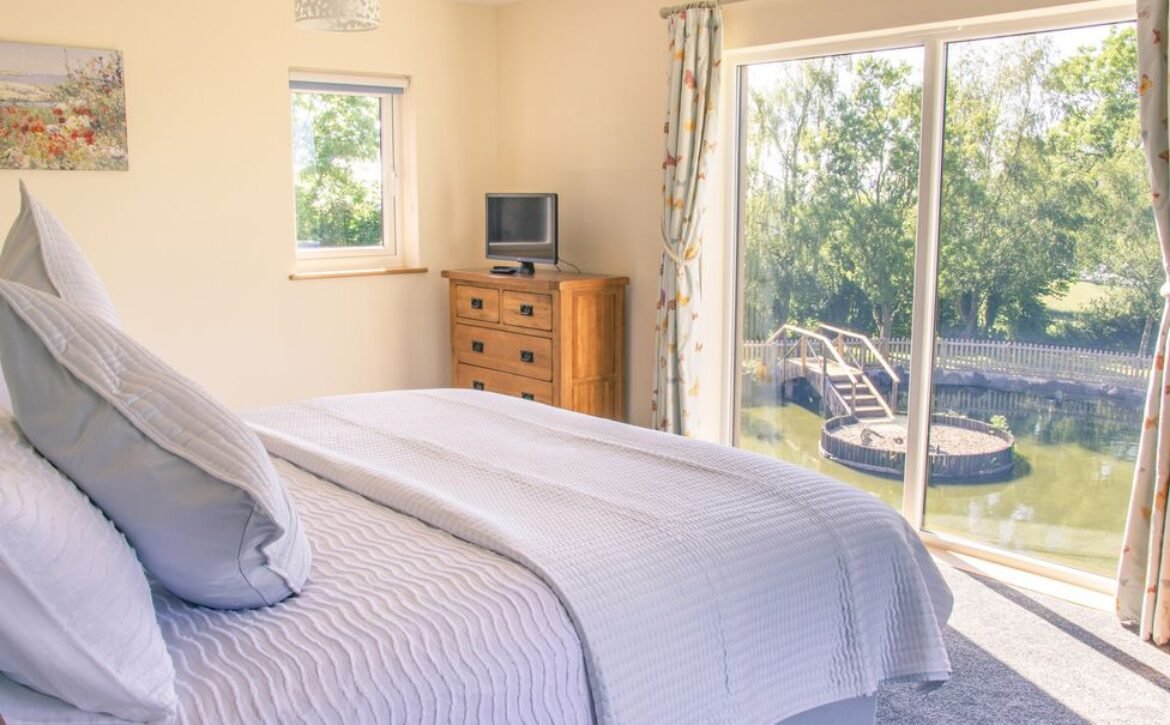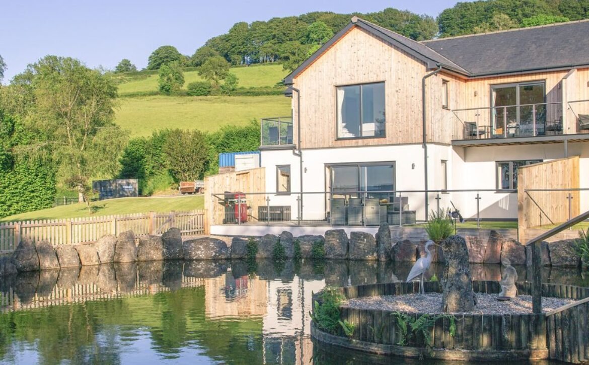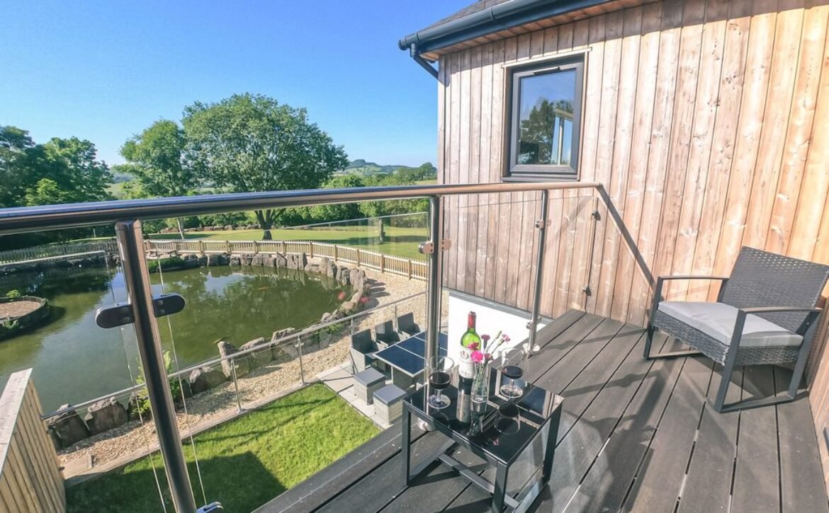 The second super-king-size bedroom has a balcony with seating area overlooking the magnificent Otter Valley and looks down on a fascinating view of the fish cruising around the pond.