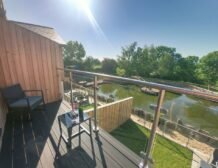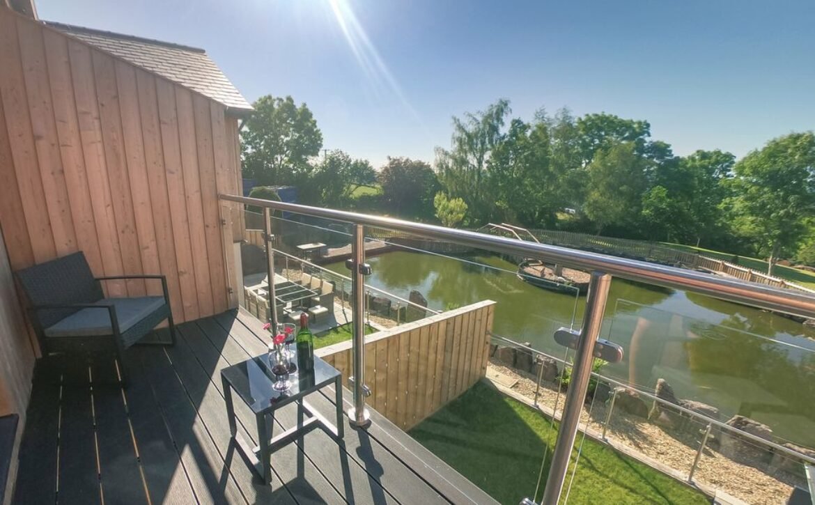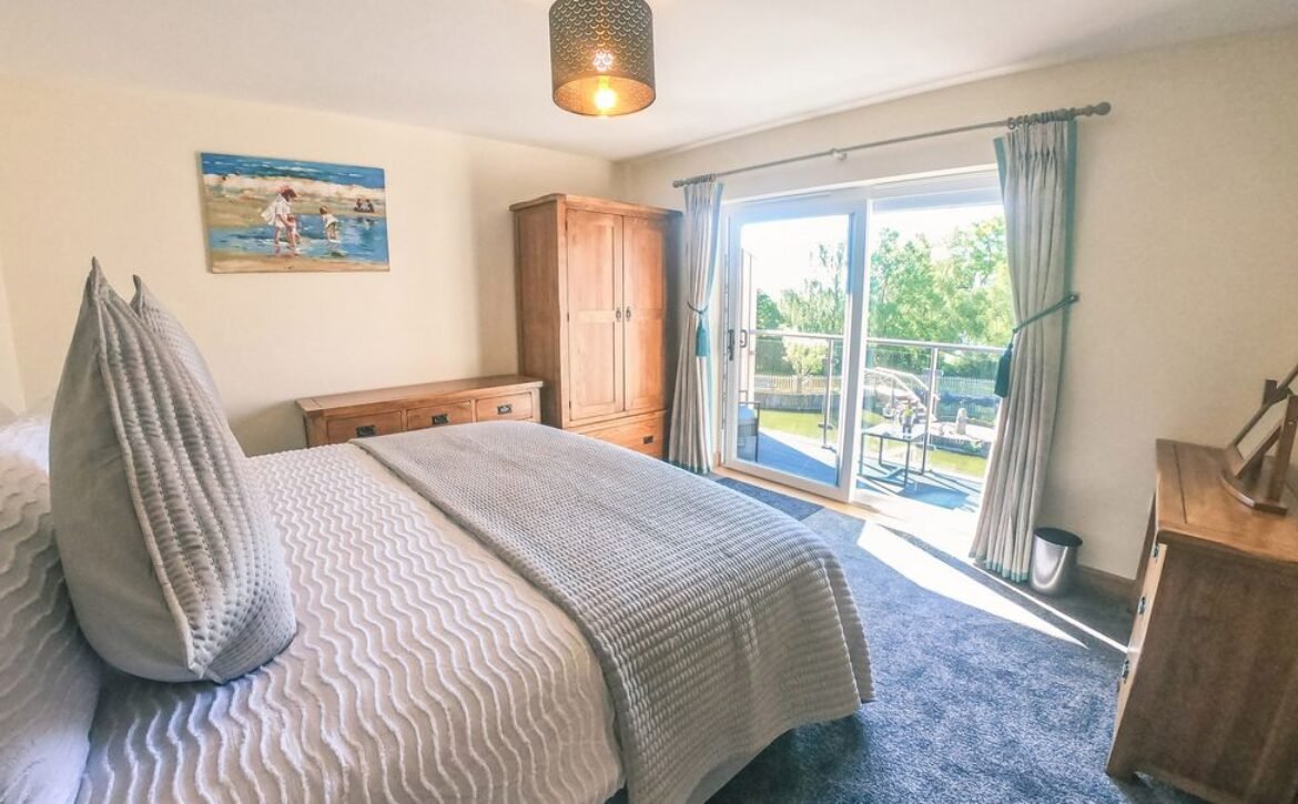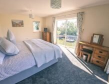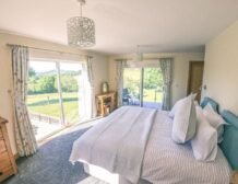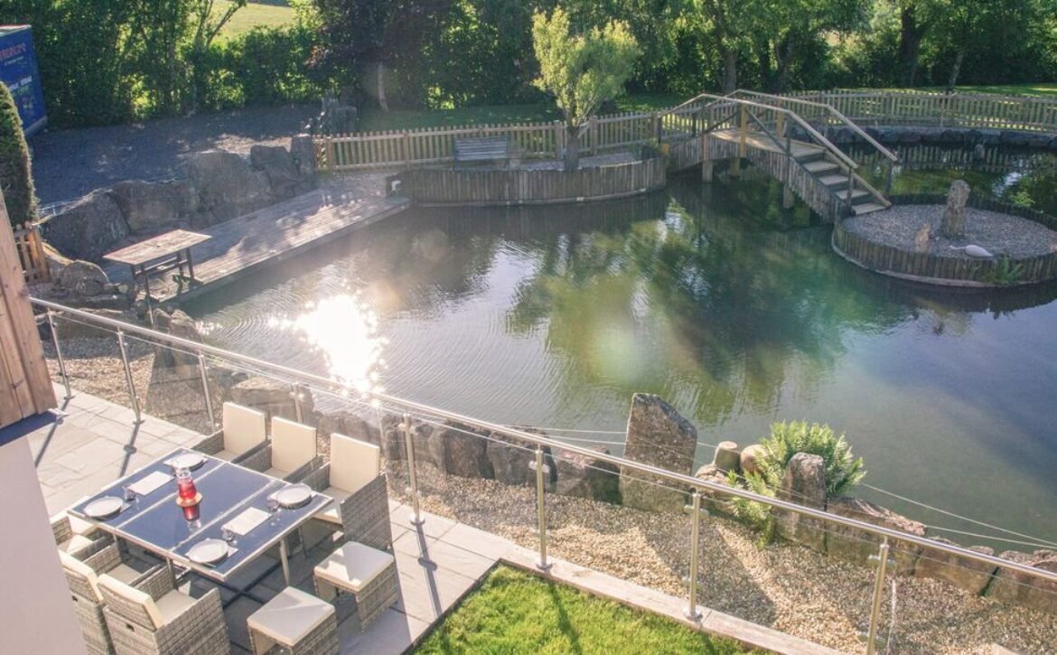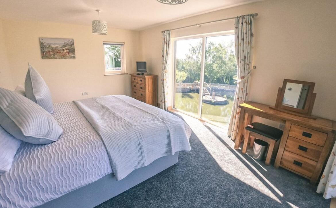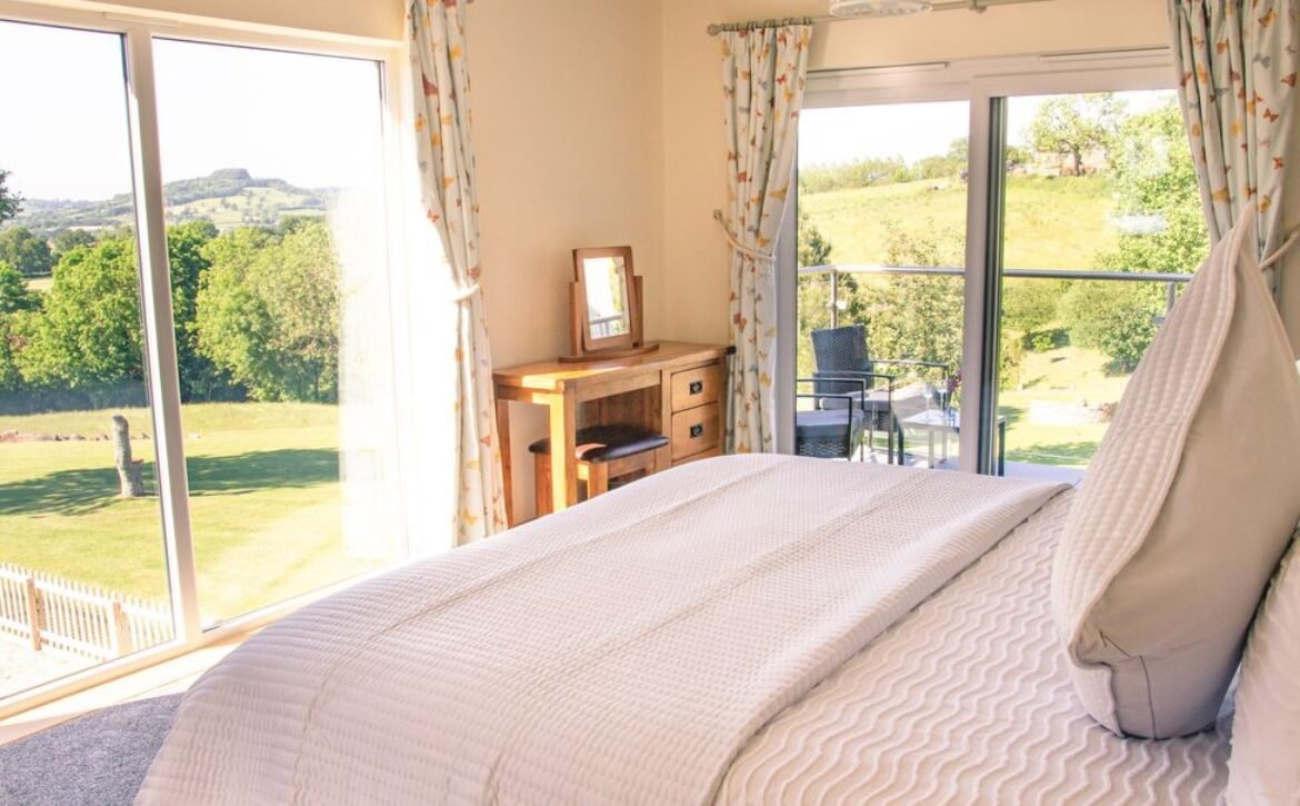 The second super-king-size bedroom has a balcony with seating area overlooking the magnificent Otter Valley and looks down on a fascinating view of the fish cruising around the pond.
