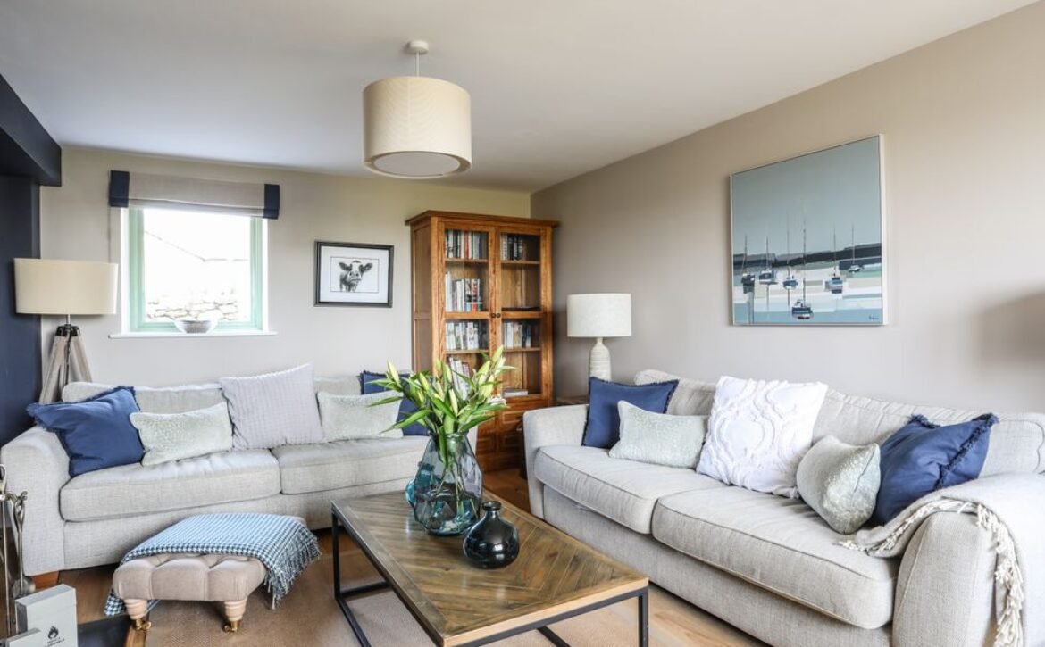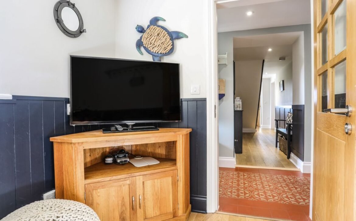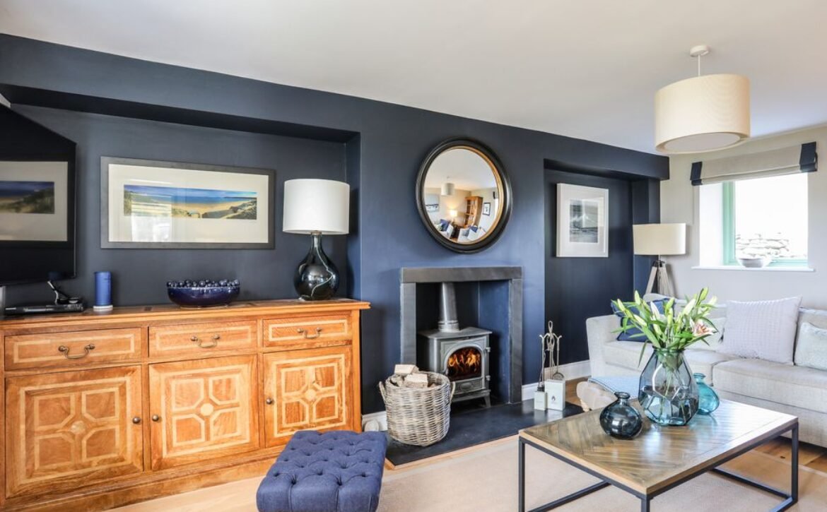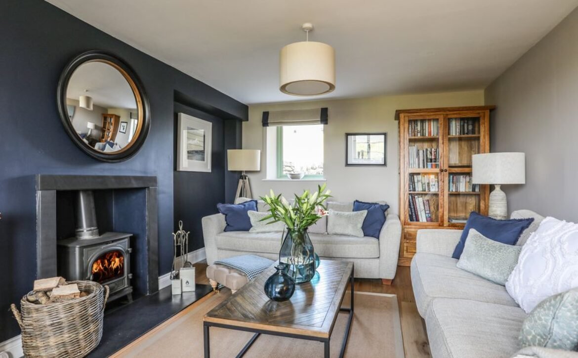 The first has comfortable sofas and chairs set around a wood burning stove and a Smart TV.