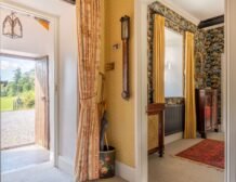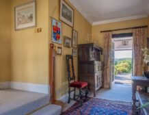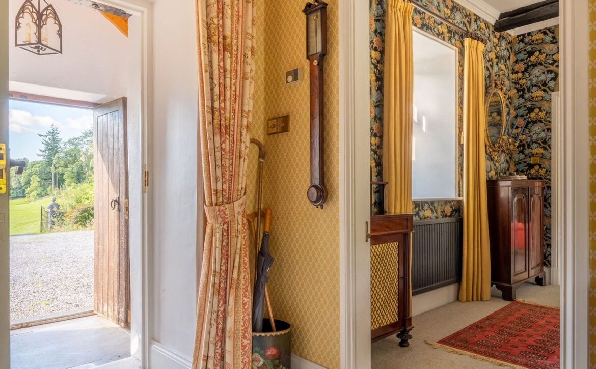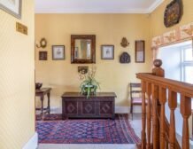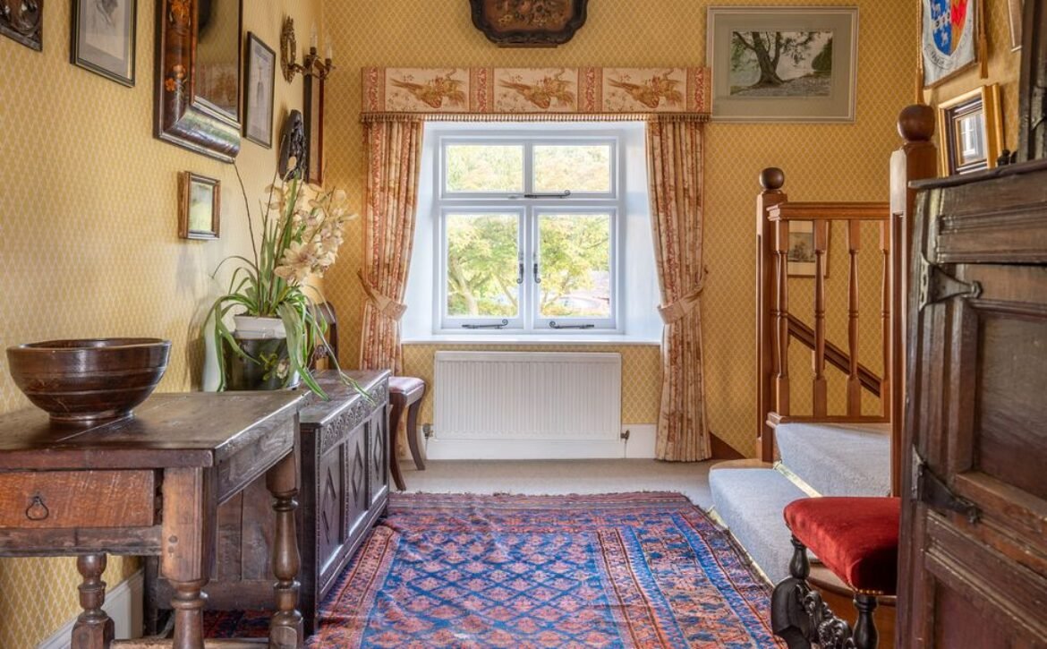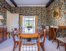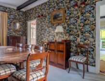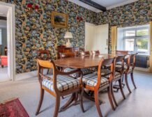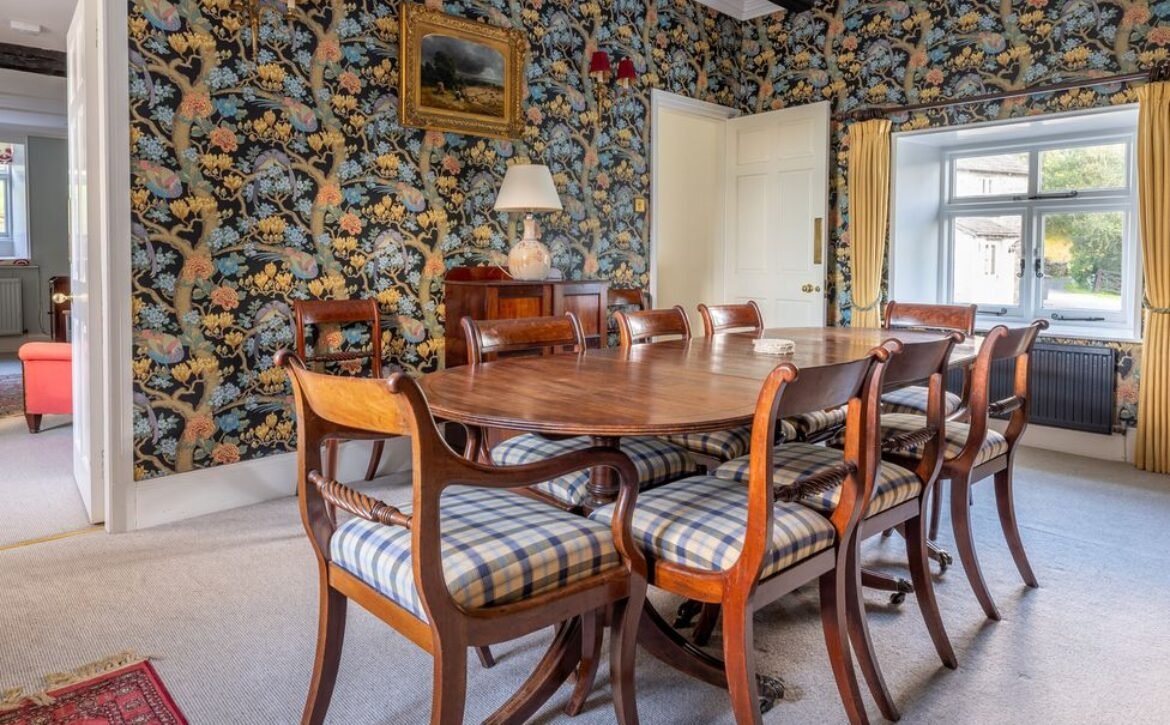 The main dining room is located back across the hallway and is layered with floral wallpaper and the large dining table is ideal for the whole family to gather around come evening.