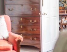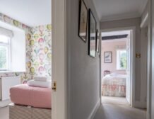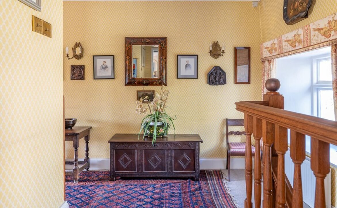 You enter a welcoming landing area, pieced together with an armchair, and intriguing décor.