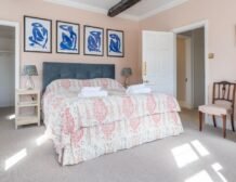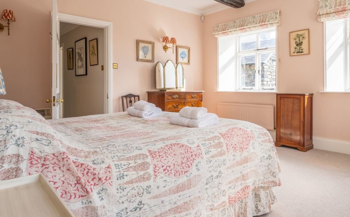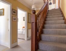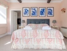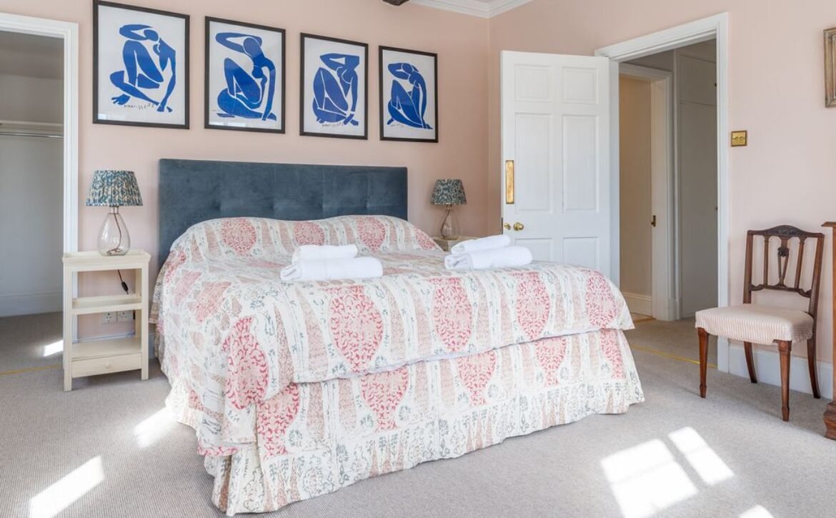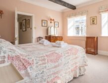 From the landing, there are stairs down to the lower ground floor complete with a super king-size double bedroom with a traditional overtone and matching bedside tables.