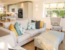 - Open-plan living space with kitchen, dining area and sitting area