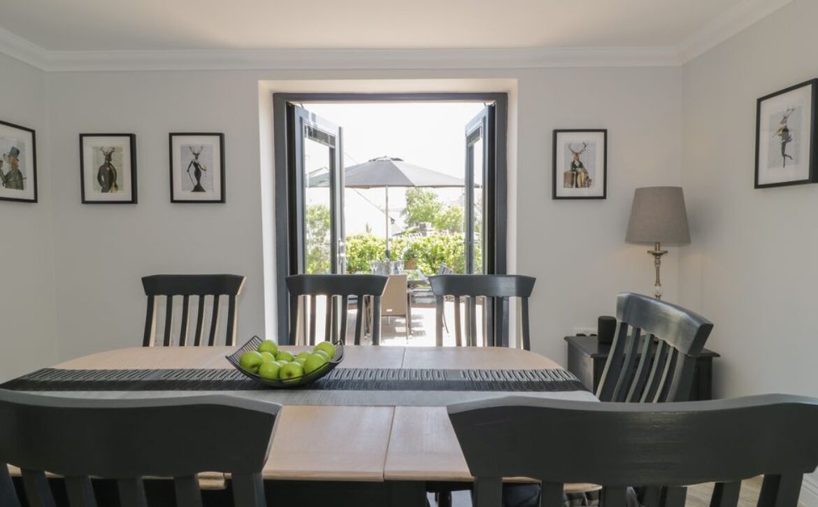 To the outside of the property, an elegant dining table offers an opportunity for alfresco dining, pop open a bottle of fizz and toast to a wonderful holiday with your loved ones, whilst admiring the stunning setting.
