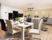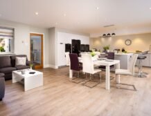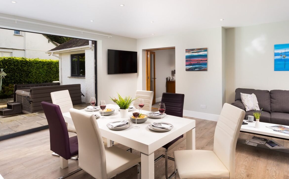 The open plan kitchen/dining room with its bi-folding doors opening out onto the patio area with hot tub is the place where friends and families will gather to enjoy this contemporary home.