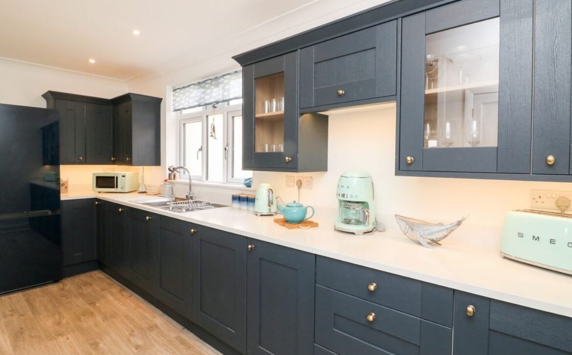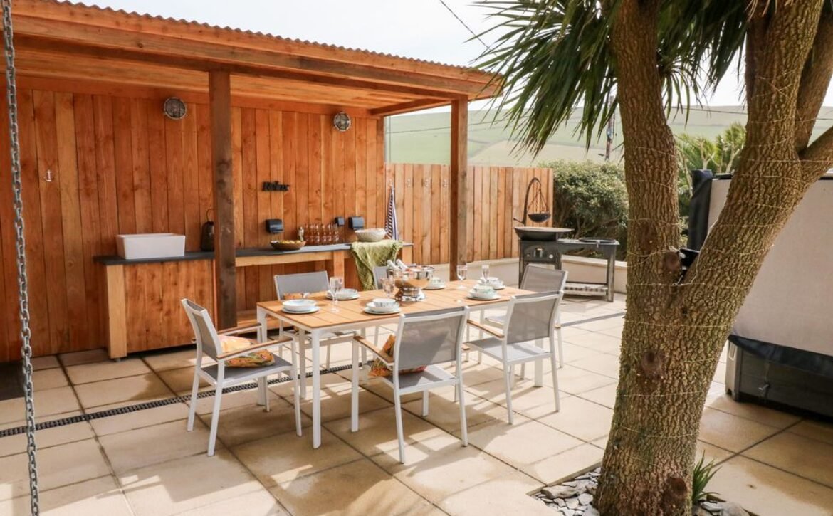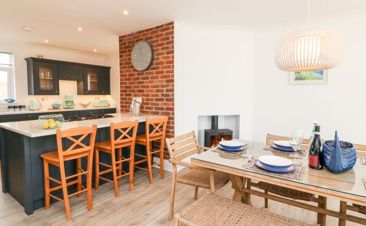 Enjoy soaking up the sunshine on the front decked area, whether that’s lounging on the outdoor furniture or submerged into the hot tub, before heading inside to the kitchen/diner, where you can dry off in front of the wood-burning stove; you’ll find everything that you need within the kitchen and utility for a convenient self-catering stay.