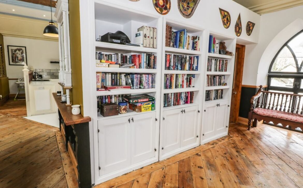 Find a cloakroom up here for your convenience, tucked behind the bookshelves of the games room, boasting stained glass windows adding even more character to this one-of-a-kind property.