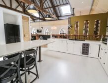 As you walk upstairs, you’ll have a chance to admire the incredible vaulted ceiling and bright, airy atmosphere that the open-plan living space creates, not forgetting the character-filled balcony overlooking the ground-floor lounge.
