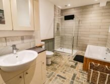 - Ground-floor bathroom with bath, walk-in shower, basin and WC