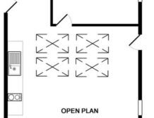 - Open-plan living space with kitchen, dining and sitting area