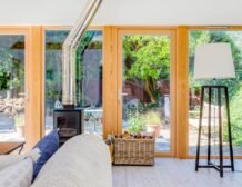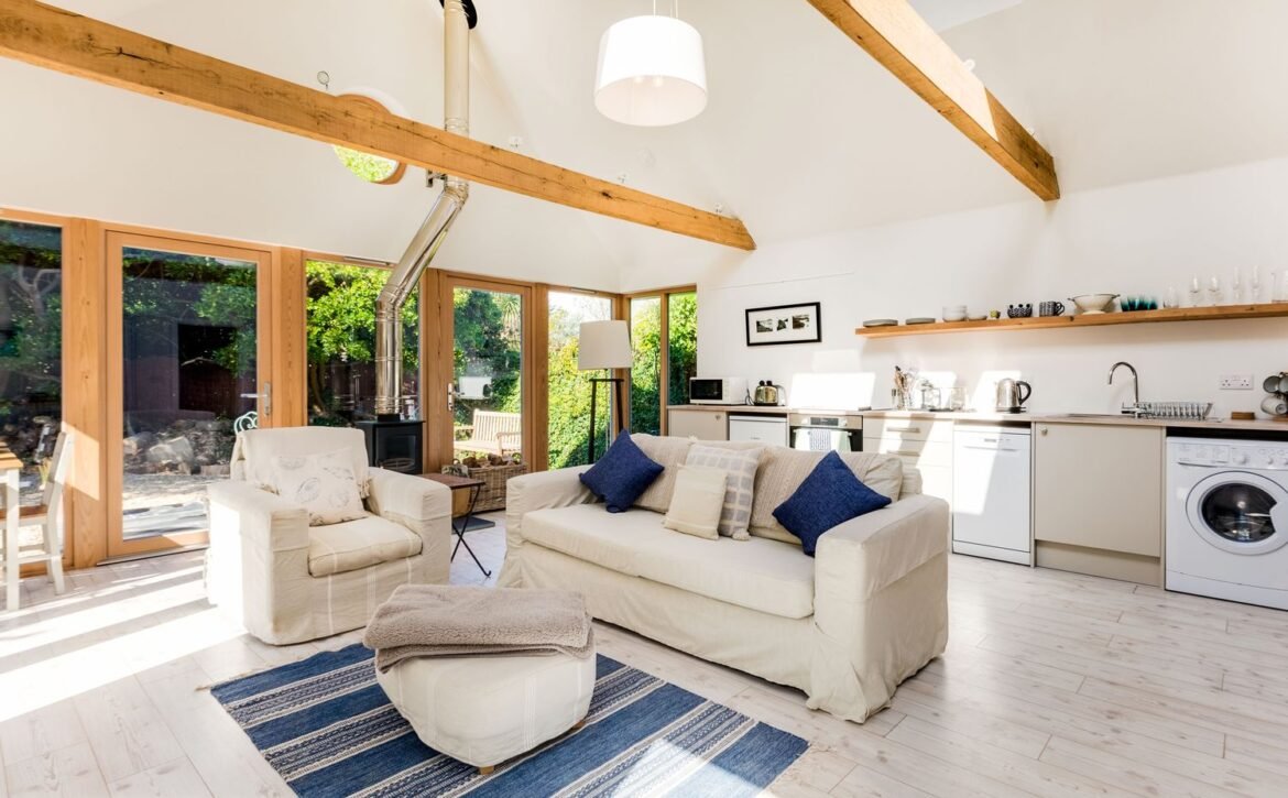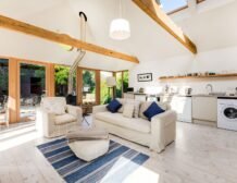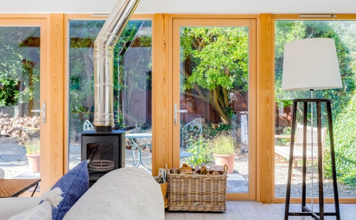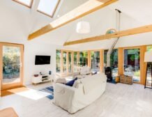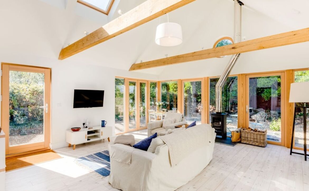 The double height ceiling, expansive glazed walls and Velux windows enhance the social space inviting in the natural light, allowing you to sink into a chair with a favourite novel or cuddle up watching a film next to the woodburning stove.