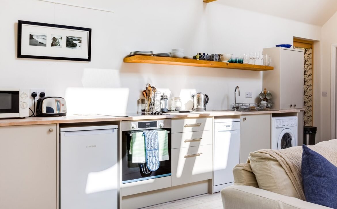 - Electric integrated oven and ceramic hob, microwave, fridge with freezer compartment, washer/dryer, dishwasher