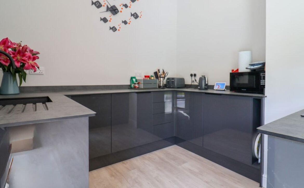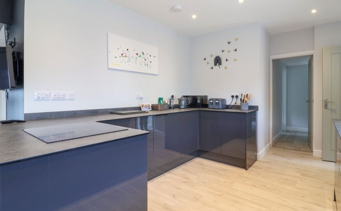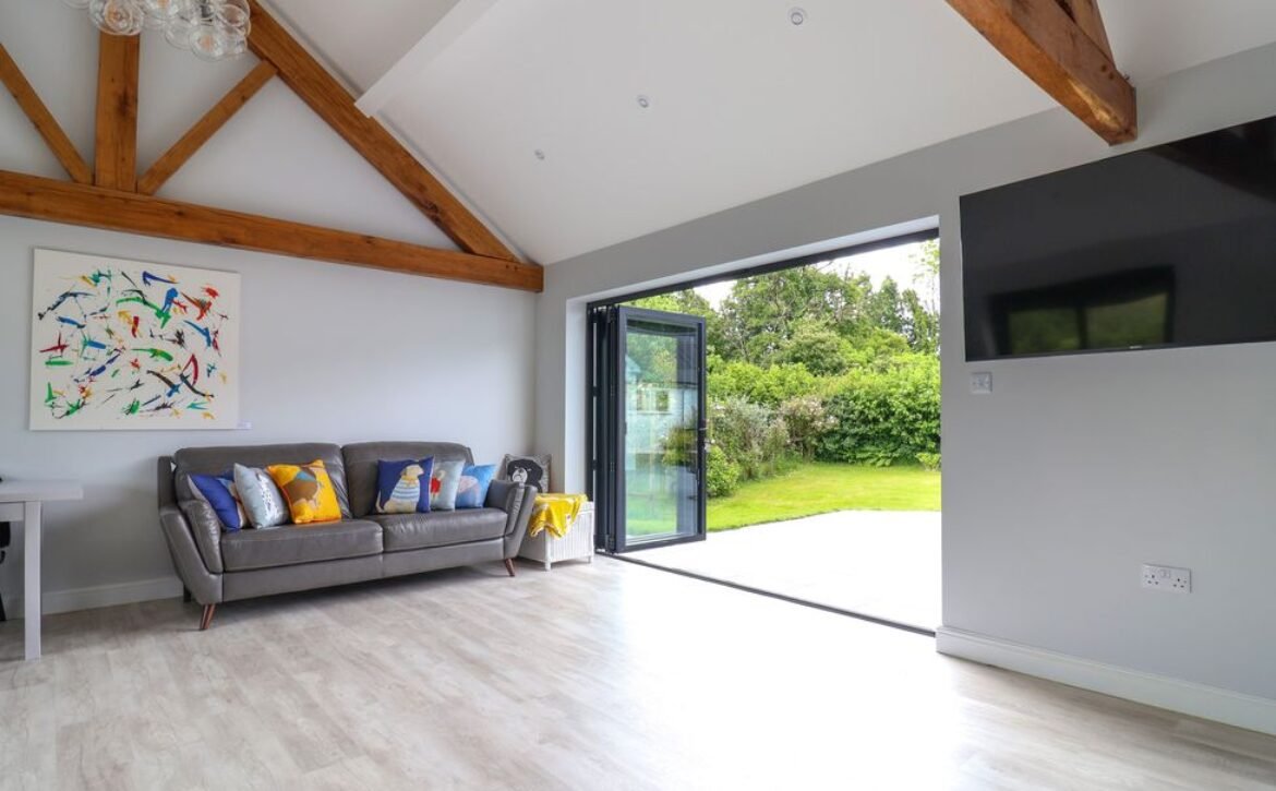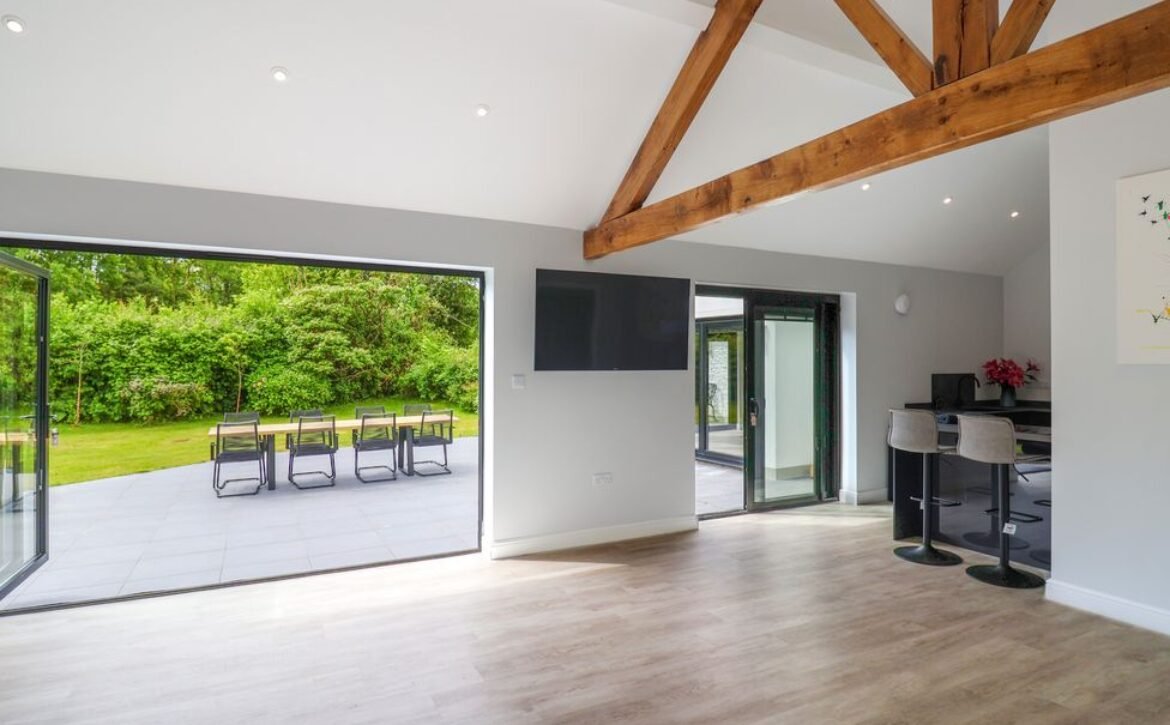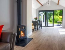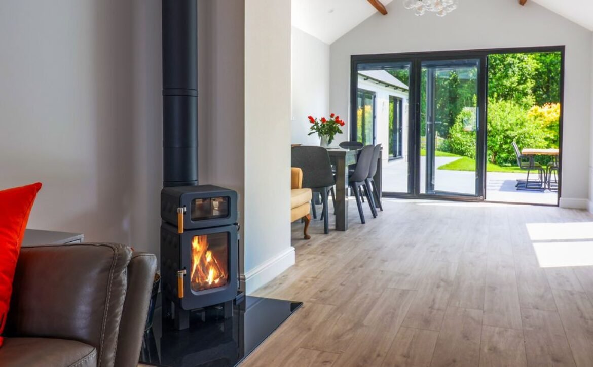 - Open-plan living space with kitchen, dining area and sitting area with woodburning stove
