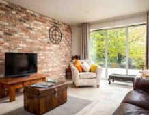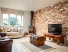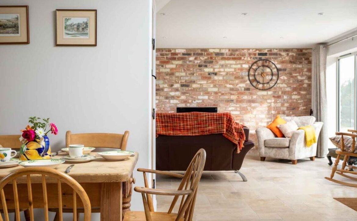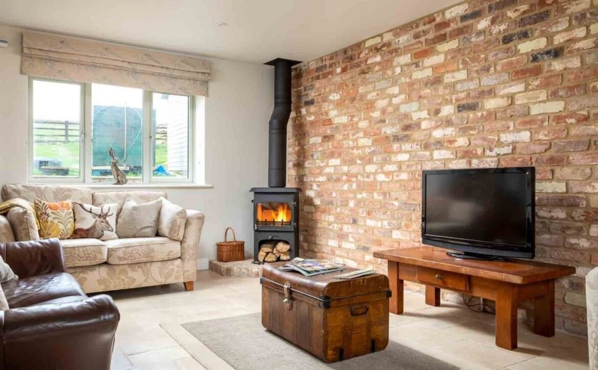 (Flynn’s Barn – 1091363) A driveway welcomes you on arrival where you can park your cars and unload your luggage in through the front door which opens directly into the open-plan living area with underfloor heating throughout home to a stylish and light dual aspect sitting area with attractive exposed brick wall and warming woodburning stove, and the kitchen/diner which is well-equipped for home cooking and socialising with your group.