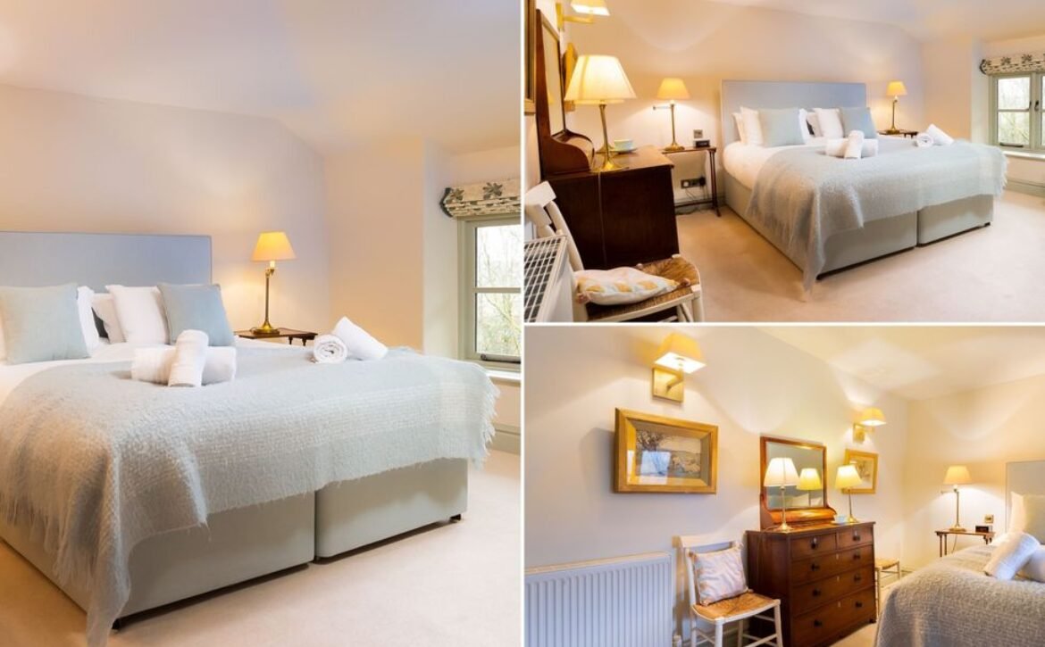 Across the first floor, there are three immaculate bedrooms to choose from, comprising of a super-king-size bedroom, a king-size bedroom with en-suite shower room and a twin, each one enjoying plush furnishings and beds draped in white linen, with plenty of storage for your personal belongings.