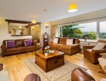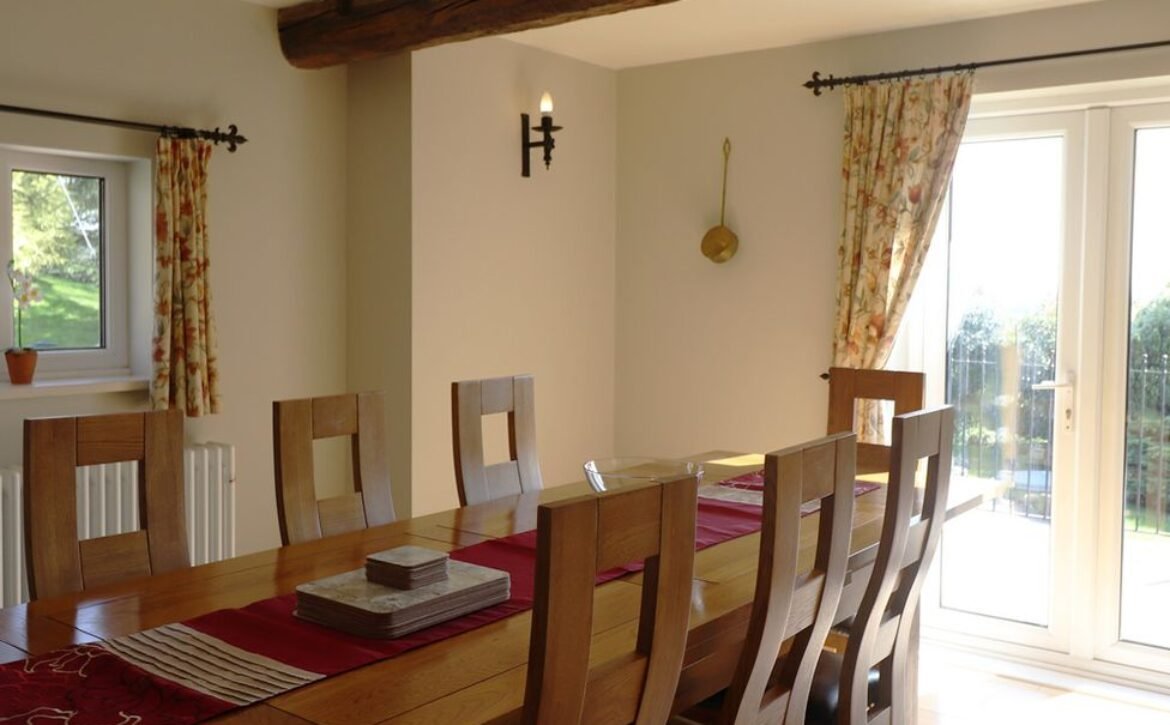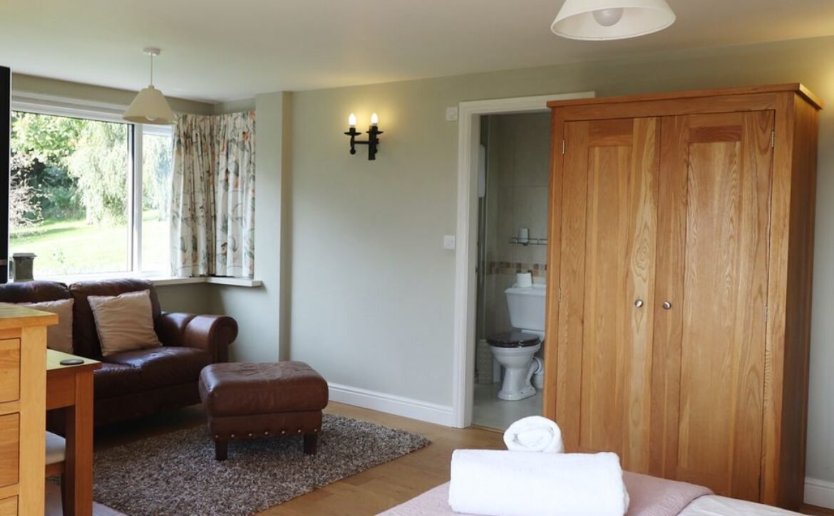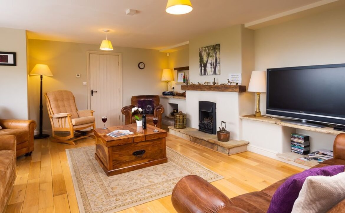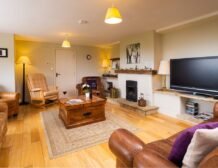 The room is beautifully furnished with comfy leather sofas, and to one end is a solid oak dining table, great for sociable meals.