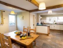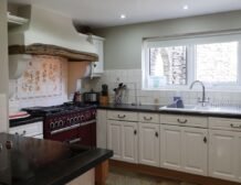 The chic country kitchen is spacious and has a large range cooker, and a smaller dining area.