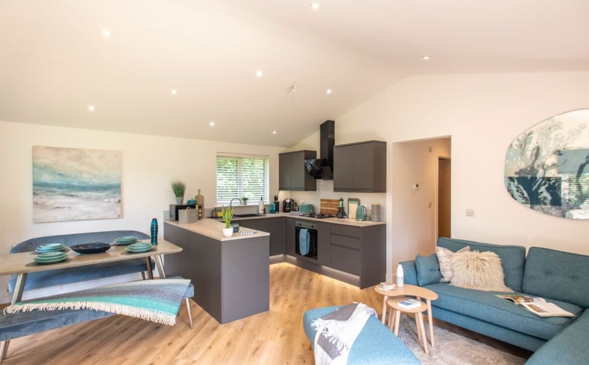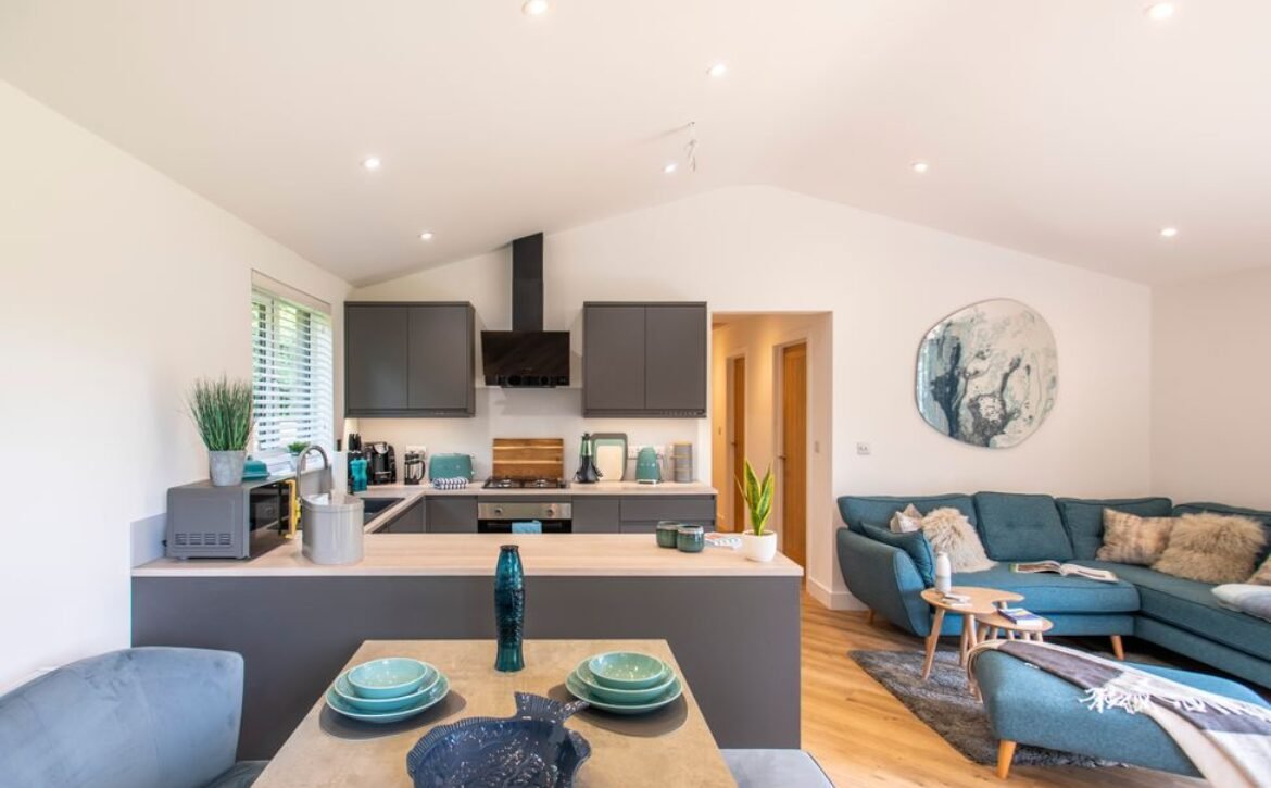 The heart of the lodge is the open-plan living space, boasting a contemporary kitchen, dining area, and a spacious sitting area with ample seating and yet another Smart TV for your entertainment.