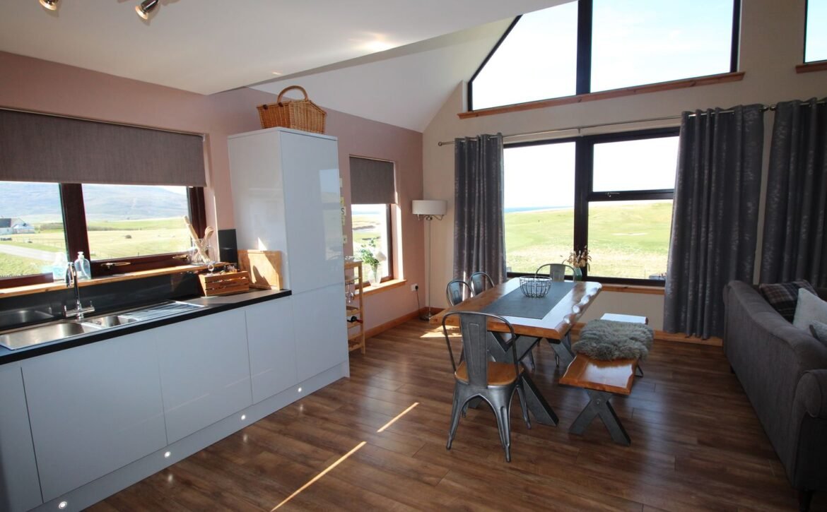 Within this space you will find a relaxing sitting area with a TV, perfect for a family games night, and why not utilise the fantastic kitchen, creating a masterpiece with your friends and family out of the local produce, before presenting it on the central wooden dining table bedside the magnificent windows?