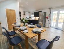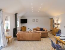 - Open-plan living space with kitchen, dining and sitting area with woodburning stove