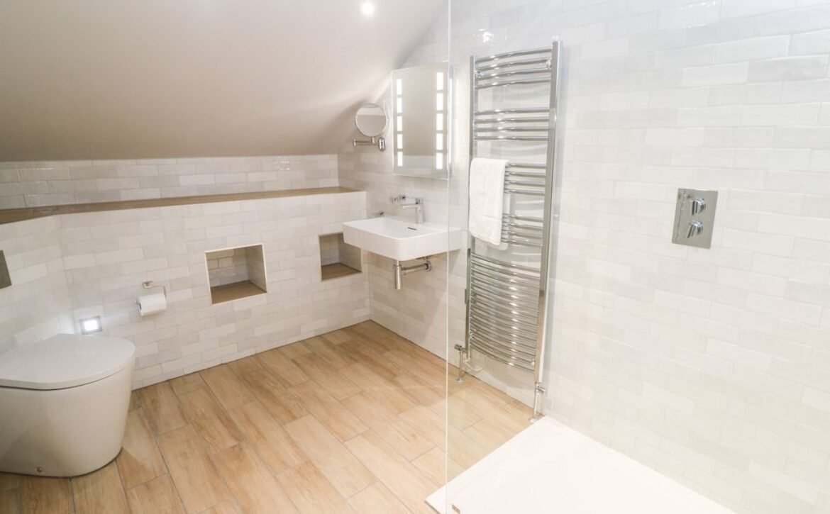 - Ground-floor bathroom with bath, shower over, basin, heated towel rail and WC