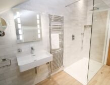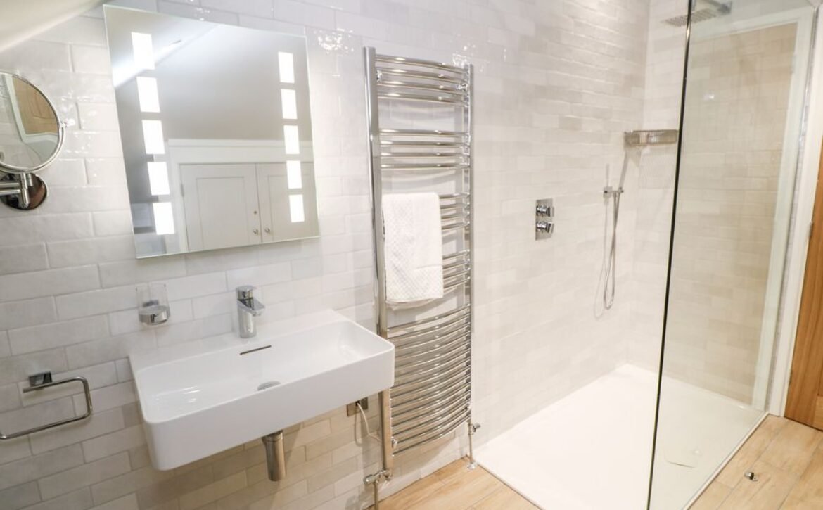 - Four bedrooms: 1 x super-king-size with Smart TV, balcony and en-suite walk-in shower, basin, heated towel rail and WC, 1 x king-size with Smart TV and en-suite walk-in shower, basin, heated towel rail and WC, 1 x ground-floor king-size with Smart TV and en-suite walk-in shower, basin, heated towel rail and WC, 1 x ground-floor twin (zip/link, can be super-king-size on request) with Smart TV