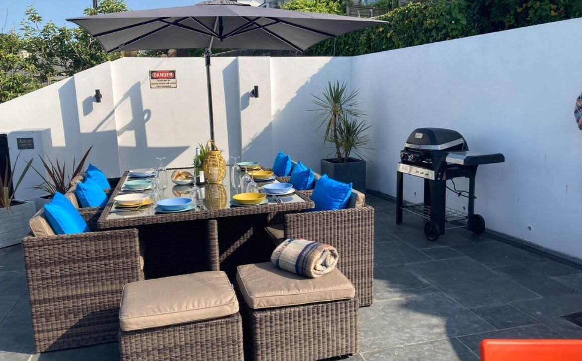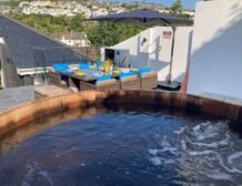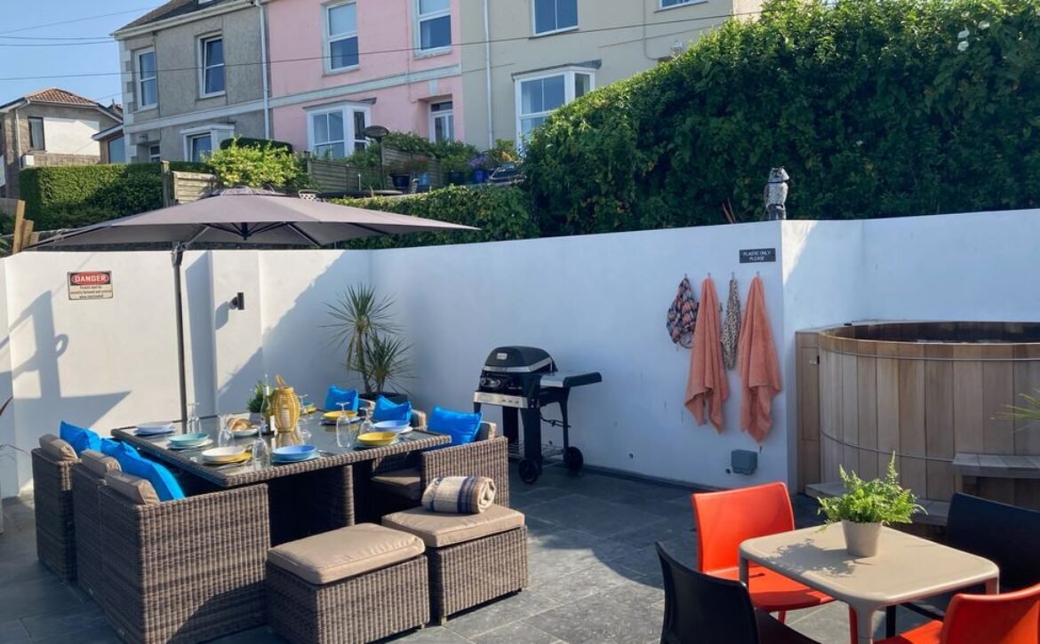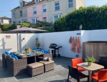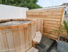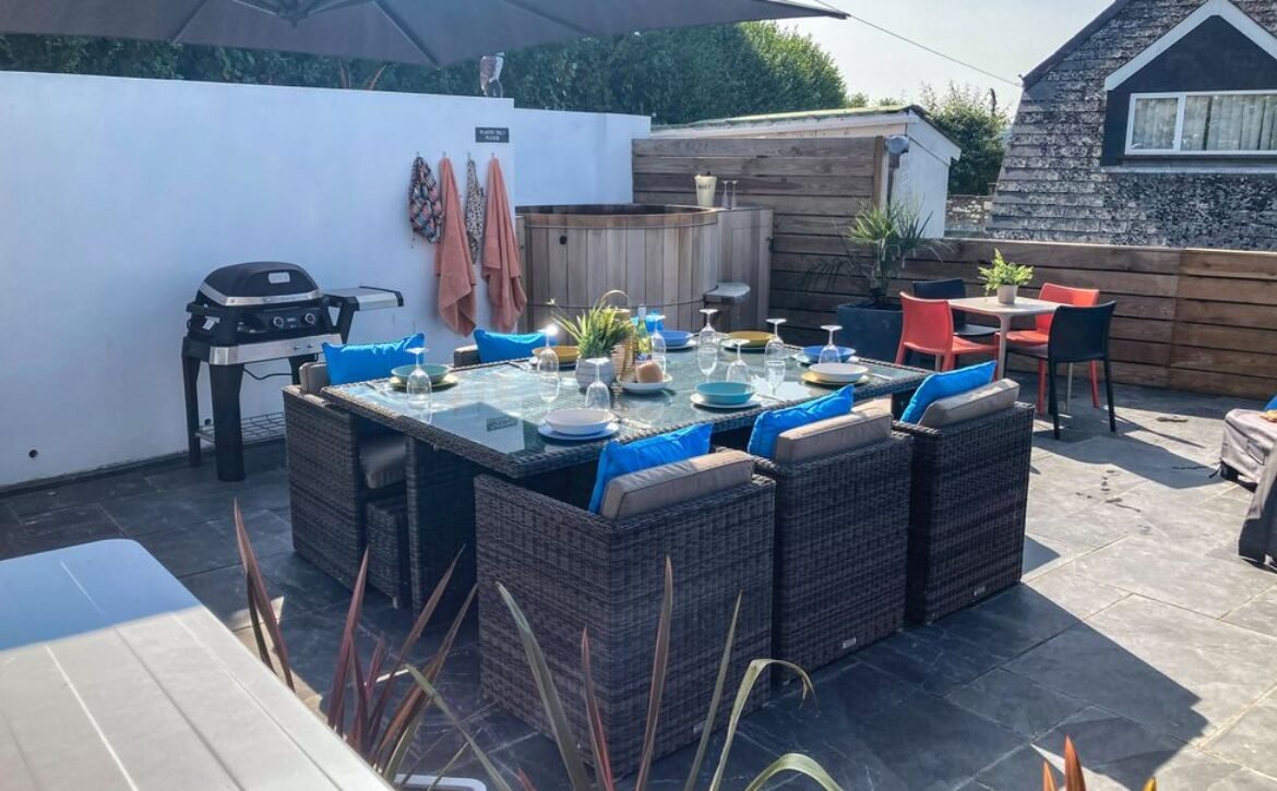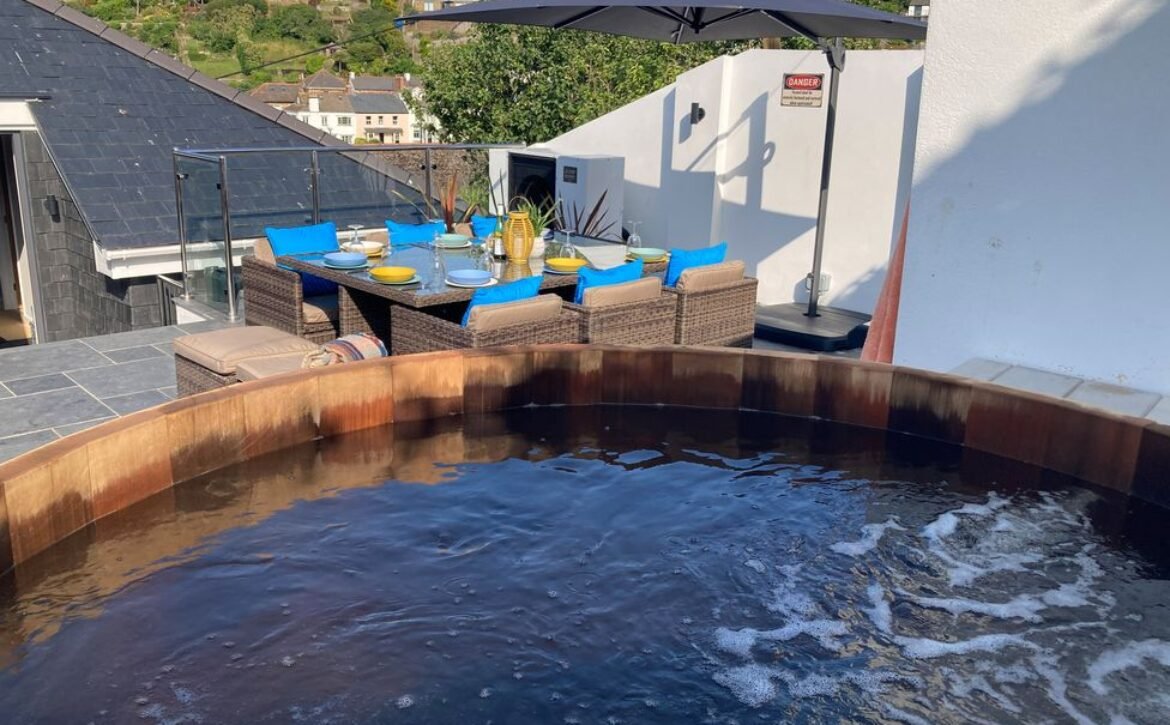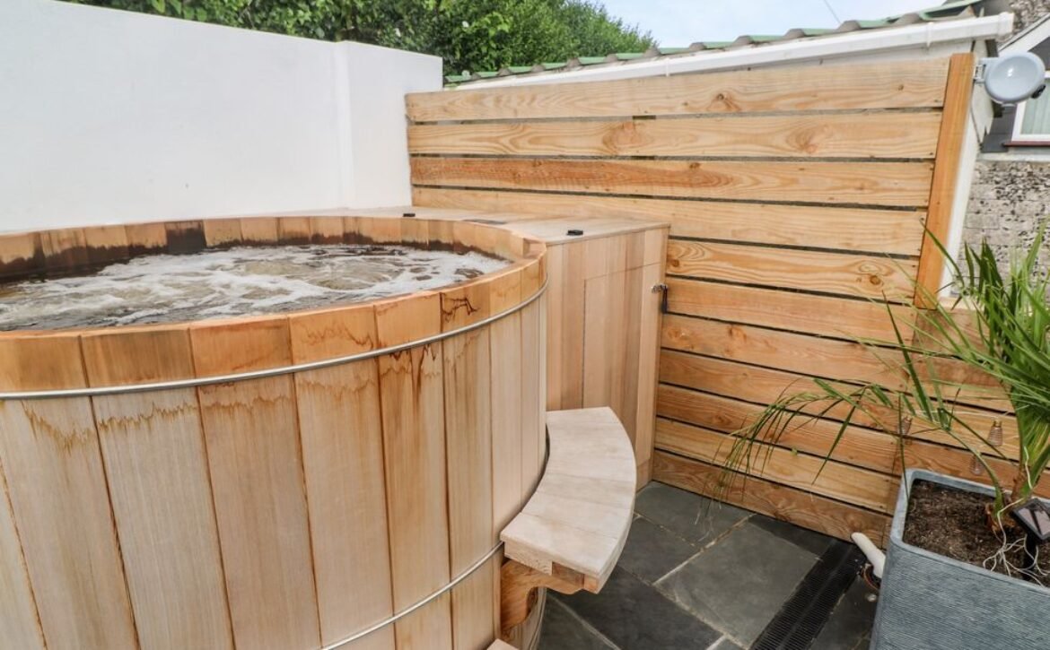- Front balcony with patio and dining seating, rear garden with furniture, wooden hot tub (seats up to 8) and electric barbecue