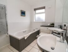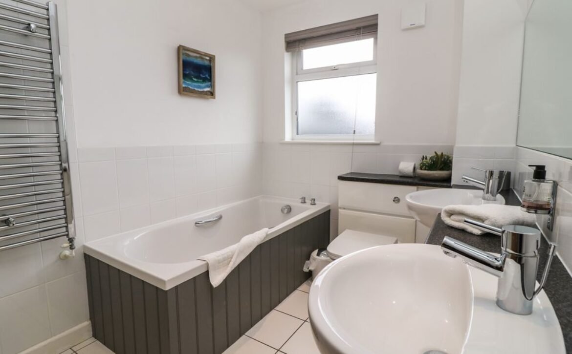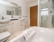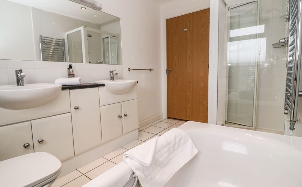 - Bathroom with bath, separate shower, twin basin, heated towel rail and WC