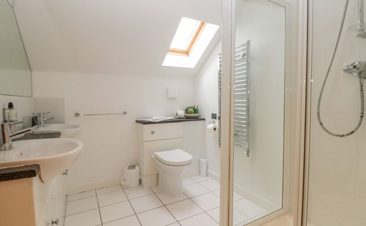 - Shower room with walk-in shower, twin basin, heated towel rail and WC