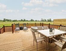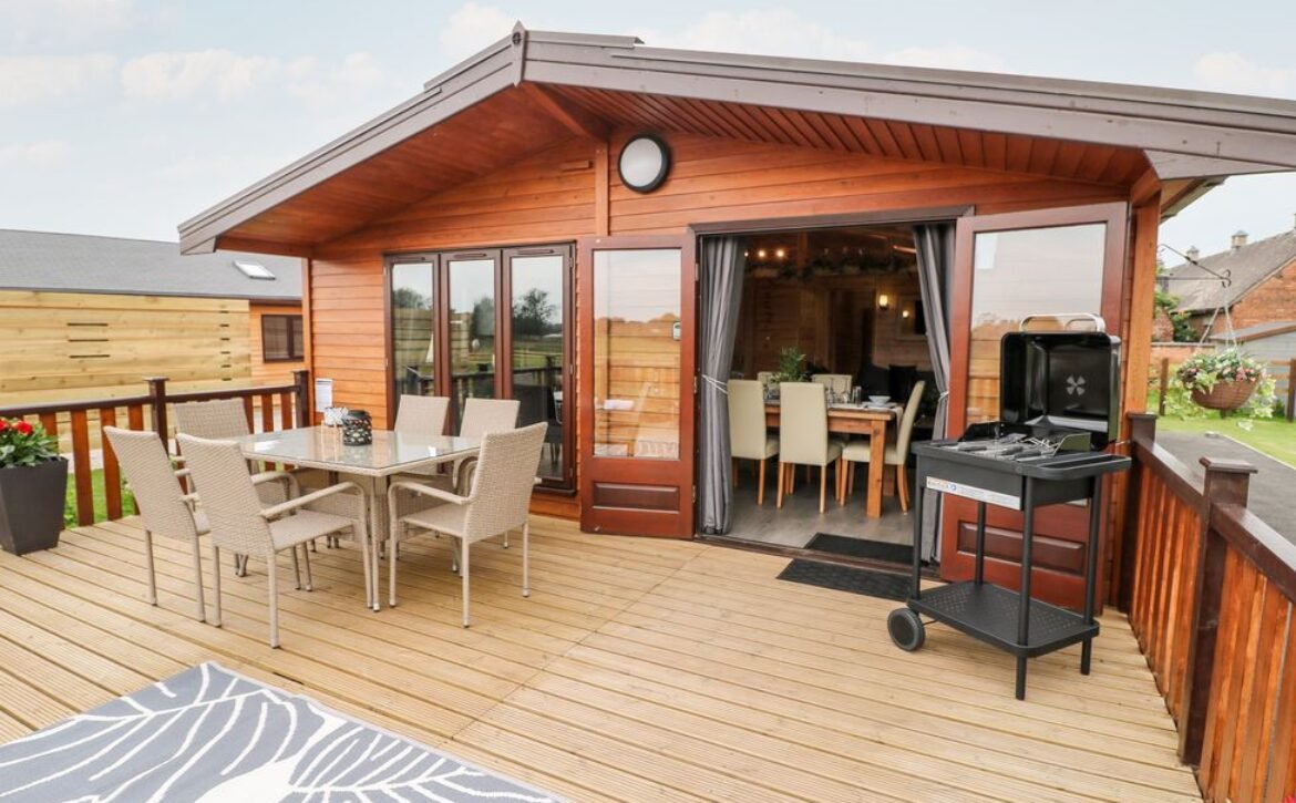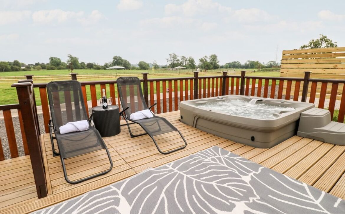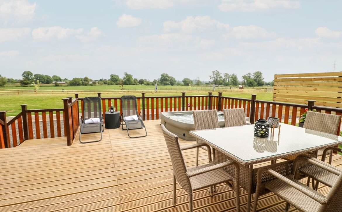 - Communal lawn area with table and chairs, as well as a private decked area with sun loungers, dining table, barbecue and hot tub