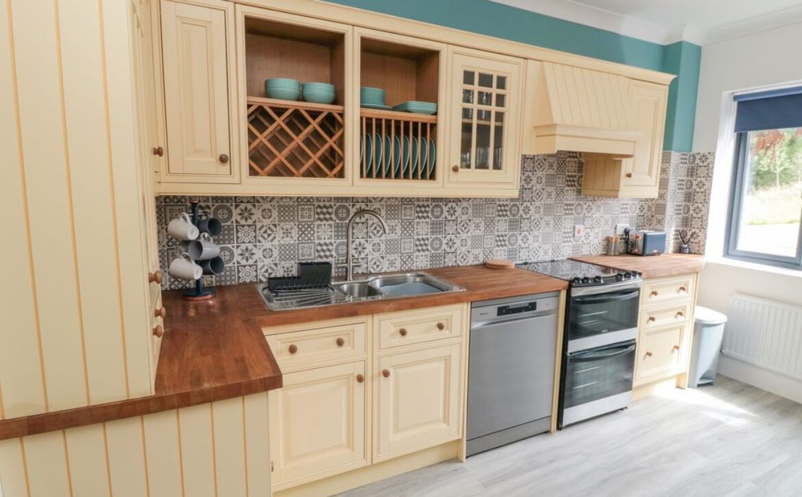 - Electric oven and hob, microwave, American-style fridge/freezer and dishwasher, air fryer
